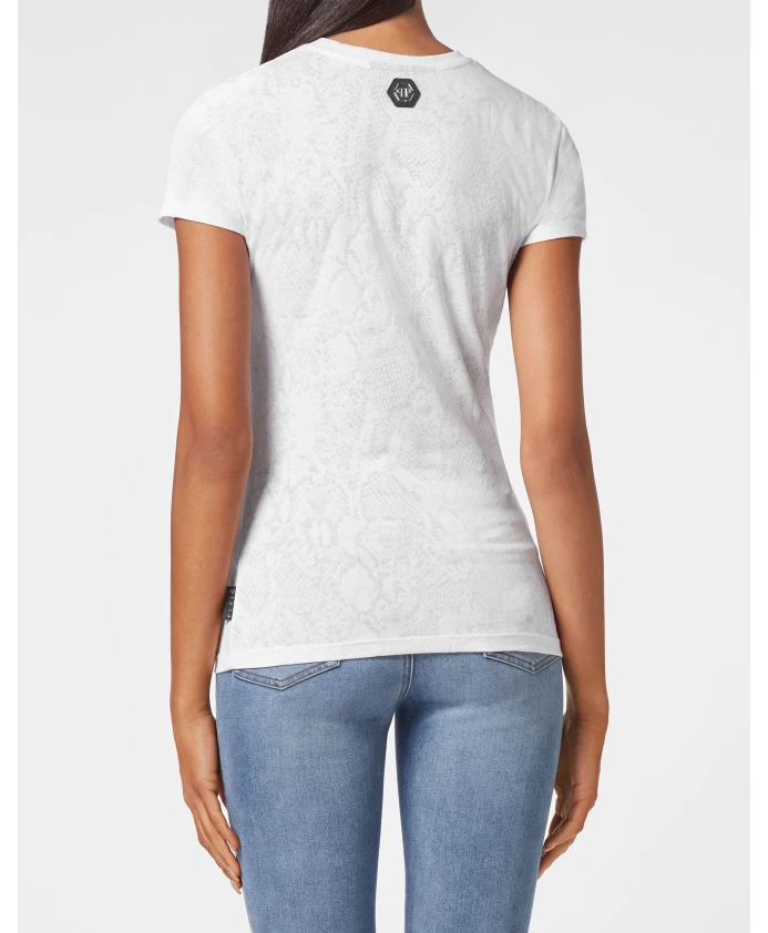 Футболка Philipp Plein с круглым вырезом - это обновленная версия футболки из хлопкового трикотажа с круглым вырезом, украшенная логотипом с драгоценными камнями и шестиугольной нашивкой из сафьяновой кожи PP, создающая стильный уличный образ. Ключевые особенности: Белый | Хлопковый трикотаж, полиэстер, кожа | Шестиугольная нашивка из сафьяновой кожи PP, пришитая к кокетке | Двухслойная стежка | Ребристый вырез горловины | Логотип с драгоценными камнями на передней части | Эффект кожи питона на ткани деворе | Состав и уход: Хлопковый трикотаж | Полиэстер (деворе с эффектом кожи питона) | Сафьяновая кожа