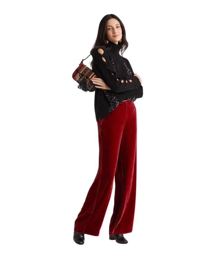 Эти струящиеся бархатные брюки от MALIPARMI отличаются глянцевой, шелковистой бархатной отделкой и широким прямым кроем, идеально подходящим как для вечерних выходов, так и для изысканных дневных образов. Ключевые особенности: Цвет: ржавый | Вискоза | Шелковистый блеск | Мягкая текстура | Широкий прямой крой | Струящийся силуэт | Размеры и посадка: Длина: 110 см | Широкий прямой крой | Состав и уход: 82% вискоза, 18% шелк | Не стирать. Гладить при температуре не выше 110°C. Не сушить в сушильной машине. Не отбеливать. Только химчистка (перхлорэтилен - щадящий режим или углеводороды - щадящий режим).