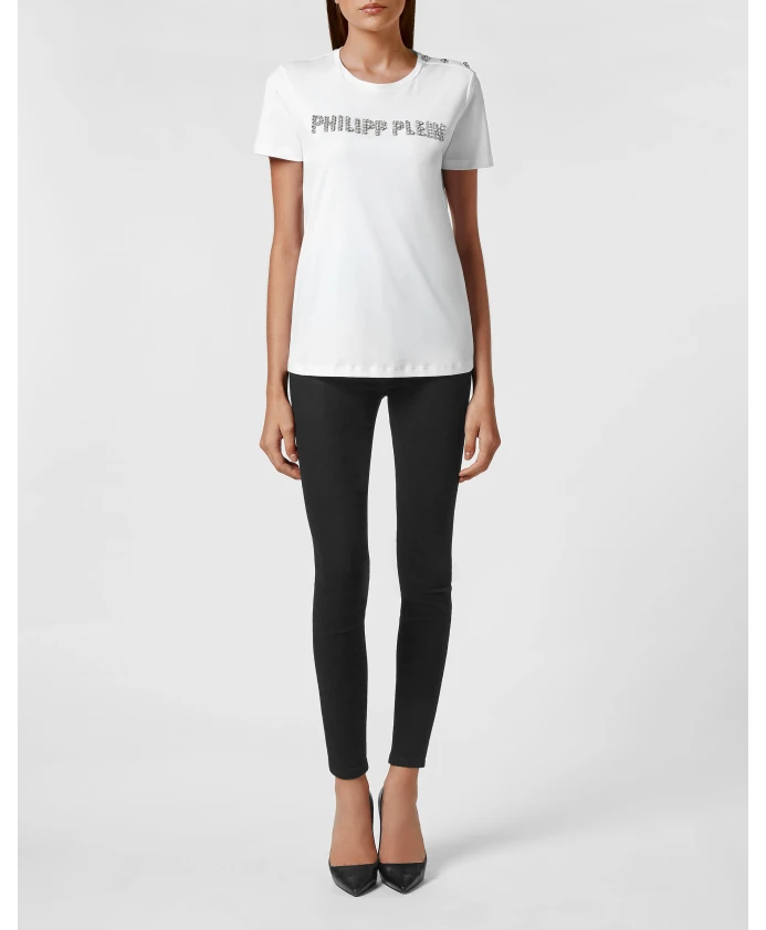 Футболка Philipp Plein с круглым вырезом, эффектным логотипом, украшенным стразами, и декоративными пуговицами. Футболка имеет пришитый шестиугольный логотип на кокетке и ребристый трикотажный воротник для классического вида. Основные характеристики: Белый | Хлопок | Двойная строчка по низу | Декоративные пуговицы | Ребристый трикотажный воротник | Логотип, украшенный стразами | Шестиугольный логотип, пришитый на кокетке | Декоративные пуговицы | Размеры и посадка: Стандартный крой | Состав и уход: 100% хлопок | См. этикетку по уходу; обращайтесь со стразами и декоративными элементами бережно.