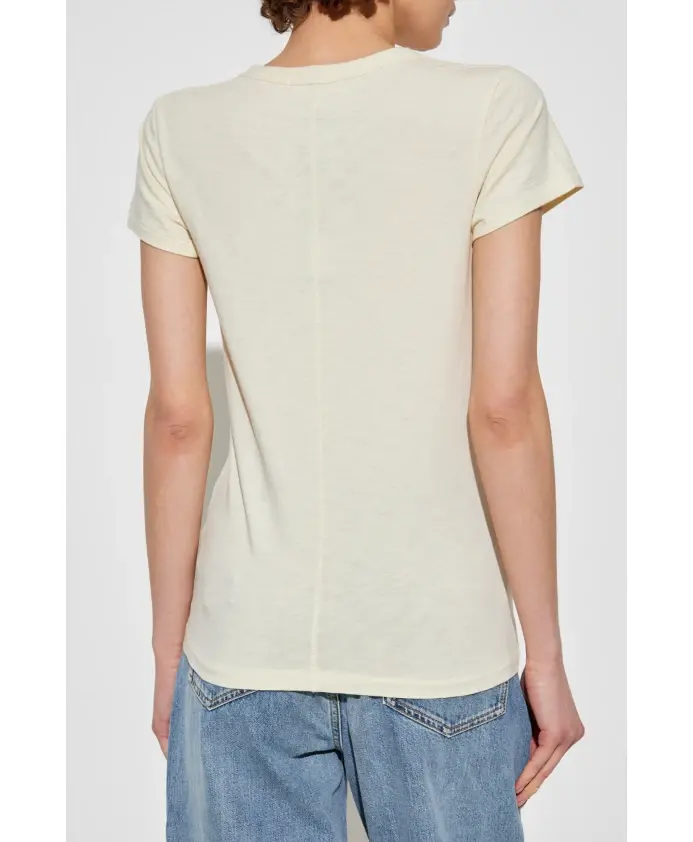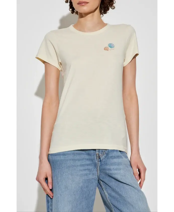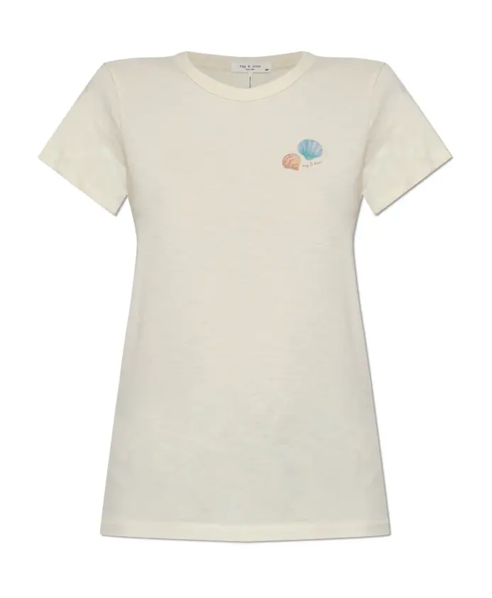 Футболка Rag & Bone с принтом - идеальное сочетание классического и современного стиля. Она изготовлена из высококачественного хлопка, обеспечивающего комфорт и свободу движений. Кремовый цвет и нежный голубовато-оранжевый принт в виде ракушек придают ей неповторимый шарм, делая ее универсальной вещью для любого гардероба. Ключевые особенности: Кремовый | Бежевый | Хлопок | Классический крой | Короткие рукава | Нежный принт в виде ракушек | Тонкая надпись | Размер и крой: Классический крой | Состав и уход: 100% хлопок | Машинная стирка в холодной воде, сушка в барабане при низкой температуре