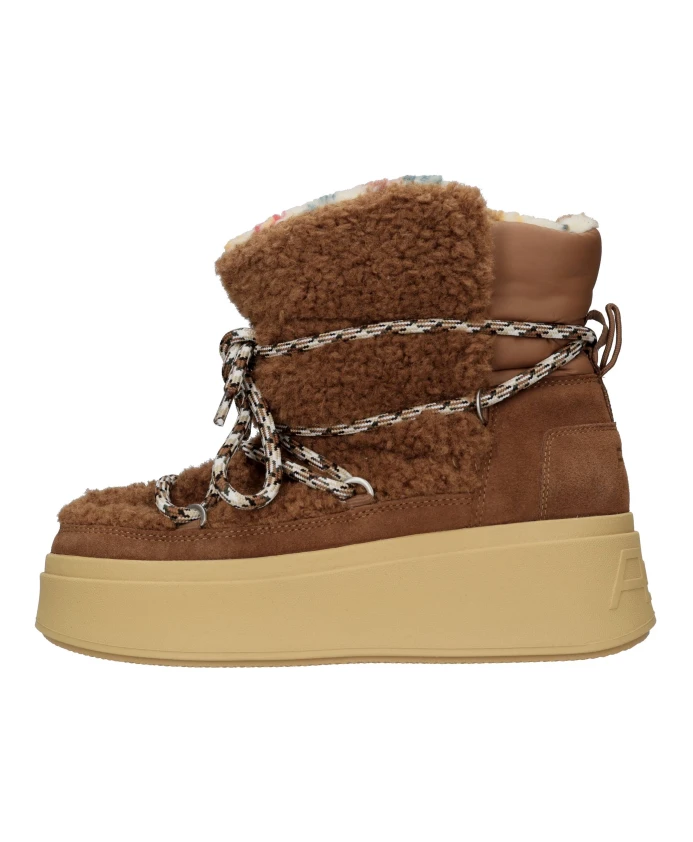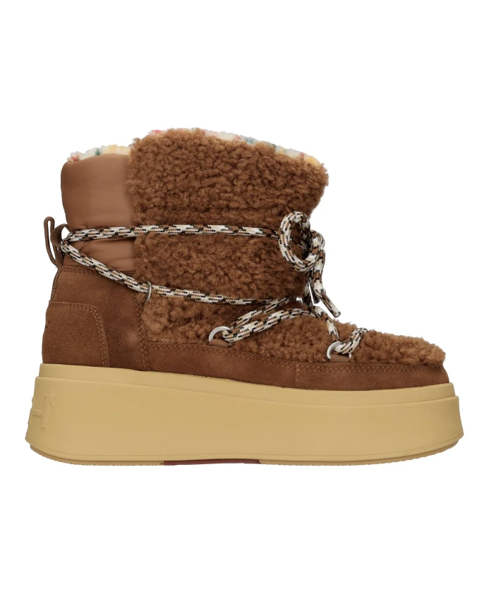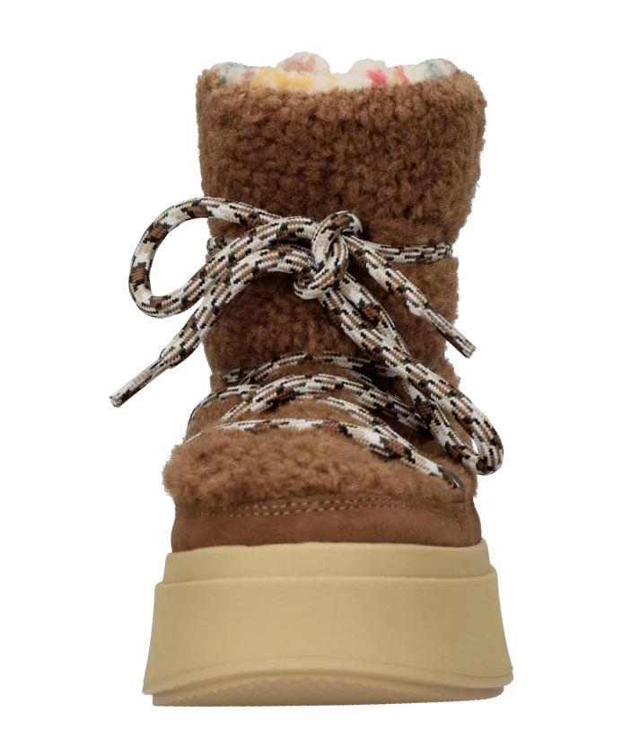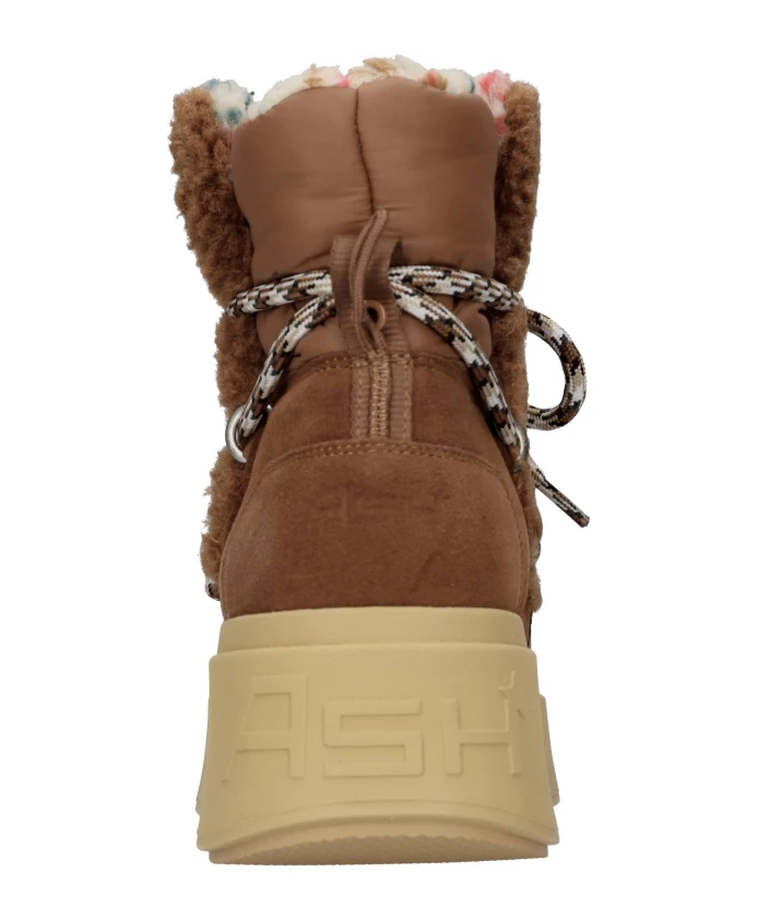 Ботильоны ASH MOBOO сочетают замшу из телячьей кожи с блестящим нейлоном и кудрявым искусственным мехом, создавая теплую, привлекательную зимнюю модель с массивной резиновой подошвой с тисненым логотипом. Ключевые особенности: Коричневый | Замша из телячьей кожи | Шнуровка спереди | Подкладка из кудрявого синтетического материала с принтом | Отделка из кудрявого искусственного меха | Резиновая подошва с принтом логотипа | Верх из комбинированных материалов (замша и нейлон) | Размеры и посадка: Высота каблука: 6 см | Состав и уход: Замша из телячьей кожи | Нейлон | Синтетический мех | Резина