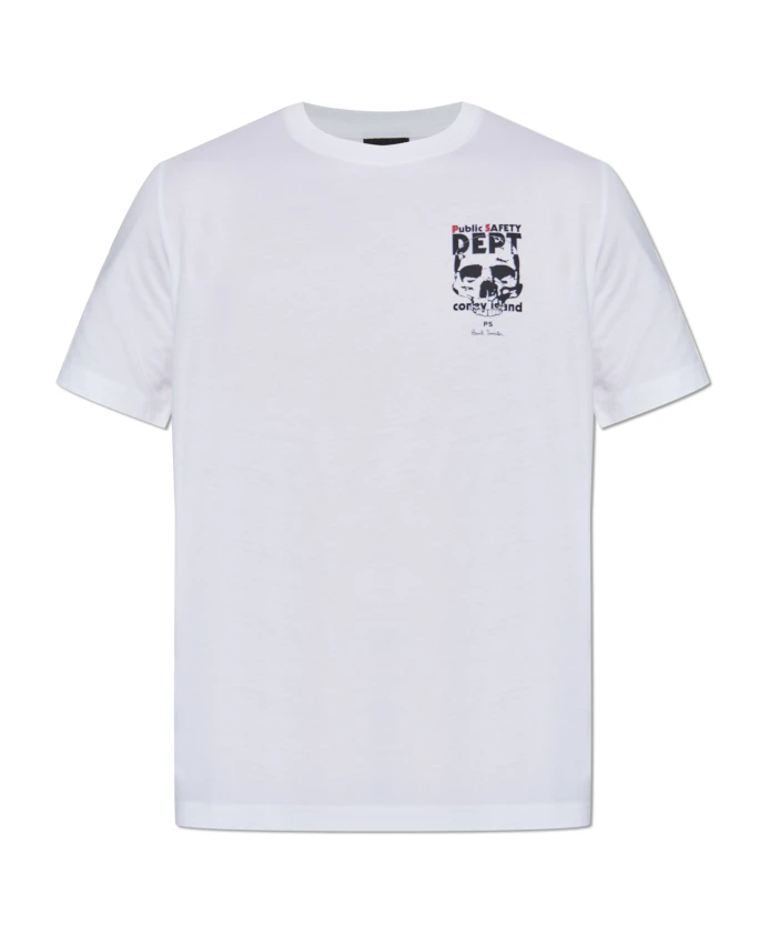 Откройте для себя футболку PS Paul Smith с ярким принтом, идеально сочетающую в себе нетрадиционный стиль и элегантность. Эта белая футболка с простым круглым вырезом и короткими рукавами идеально подойдет для того, чтобы добавить нотку изысканности в ваш летний гардероб. Ключевые особенности: Белый | Хлопок | Круглый вырез | Короткие рукава | Черно-белый принт с черепами, надписью «Public Safety Dept» и красным текстом «Safety» | Логотип дизайнера | Размер и посадка: Приталенный крой | Состав и уход: 100% хлопок | Машинная стирка в холодной воде, сушка в барабане при низкой температуре.