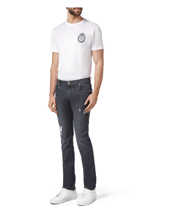 Джинсы Billionaire STATEMENT - это суперузкие брюки из эластичного денима с эффектом потертости, украшенные фирменными металлическими деталями для создания изысканного повседневного образа. Ключевые особенности: Черный | Деним | Эластичная ткань | 5 карманов | Застежка на молнию | Застежка на одну металлическую пуговицу | Эффект потертости | Металлическая нашивка на правом заднем кармане с выгравированным логотипом | Кожаная этикетка с ламинированным принтом | Декоративная строчка в тон | Металлическая пуговица с эмблемой | Размеры и посадка: Ширина штанины внизу: 17 см | Суперузкий крой