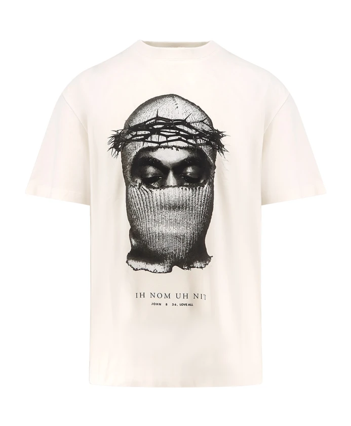 Футболка IH NOM UH NIT с принтом маски - это футболка с круглым вырезом и короткими рукавами, украшенная ярким изображением маски. Изготовлена в Италии из хлопка, идеально подходит для повседневной носки. Ключевые особенности: Белый | Кремовый | Хлопок | Круглый вырез | Короткие рукава | Изображение маски на груди | Сделано в Италии | Состав и уход: 100% хлопок | Ручная стирка. Бережная стирка при 30°C. Гладить теплым утюгом с изнаночной стороны, используя защитную ткань. Не нагревать принт. Не отпаривать. Не отбеливать. Не сушить в сушильной машине. Сушить в горизонтальном положении.
