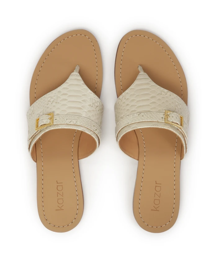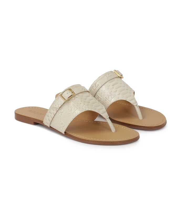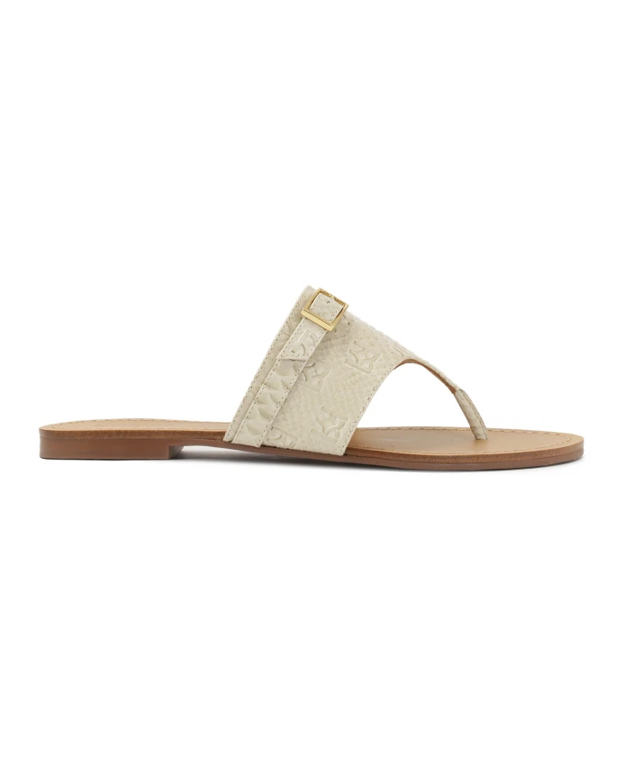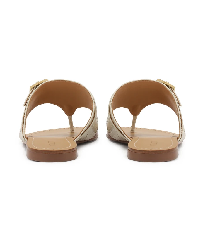 Сандалии из тисненой кожи элегантного кремового оттенка с едва заметным серым акцентом сочетают в себе стиль и современные детали. Широкий ремешок украшен ненавязчивым логотипом, добавляя изысканности и подчеркивая роскошный вид. Ремешок на мыске придает легкость и разнообразие классическому дизайну, обеспечивая при этом комфортную посадку. Благодаря универсальной цветовой гамме и уникальным деталям, эта модель идеально подходит как для повседневной носки, так и для более формальных случаев, добавляя вневременной шик. Подкладка из натуральной кожи гарантирует исключительный комфорт.