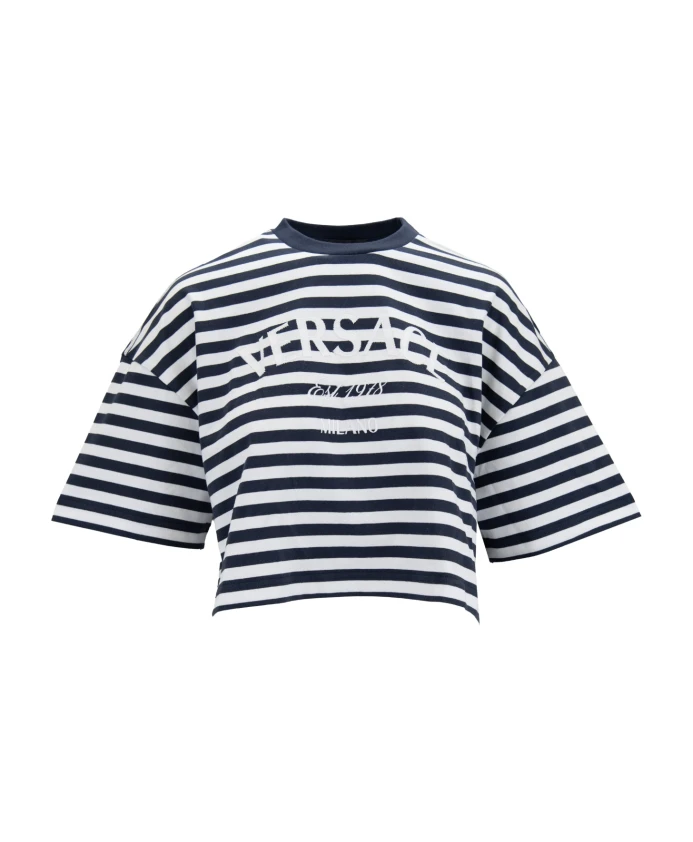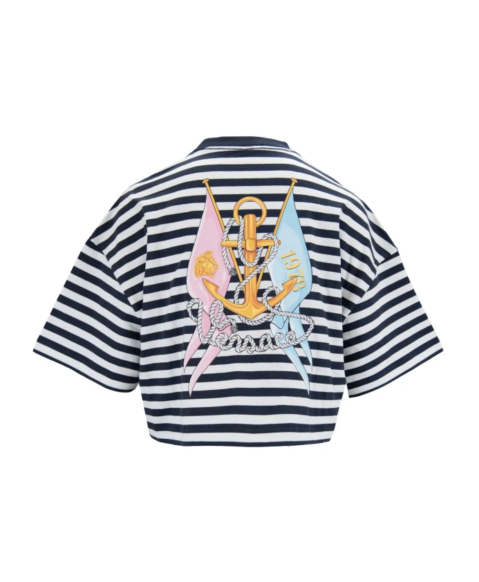 Добавьте нотку элегантности своему стилю с этим полосатым укороченным топом от Versace. Он украшен смелым вышитым логотипом и шикарным полосатым узором. Созданный для комфорта и стиля, он идеально подходит для любого повседневного случая. Ключевые особенности: Темно-синий | Белый | Синий | 100% хлопок | Круглый вырез | Короткие рукава | Полосатый узор | Тисненая вышивка | Графический принт на спине | Ребристый воротник | Размер и посадка: Стандартный крой | Состав и уход: 100% хлопок | Полиэстер | Эластан | Машинная стирка в холодной воде, сушка в барабане при низкой температуре.