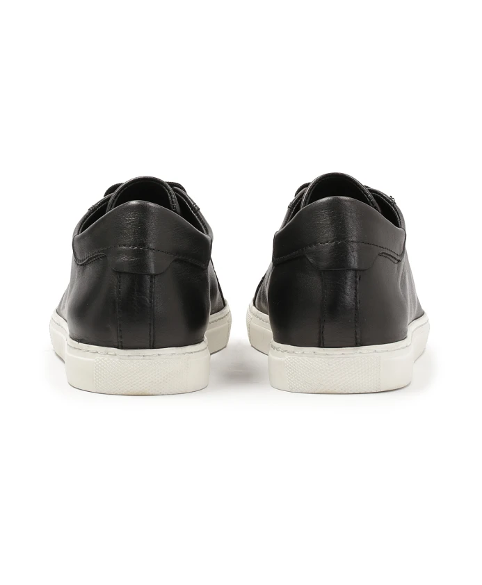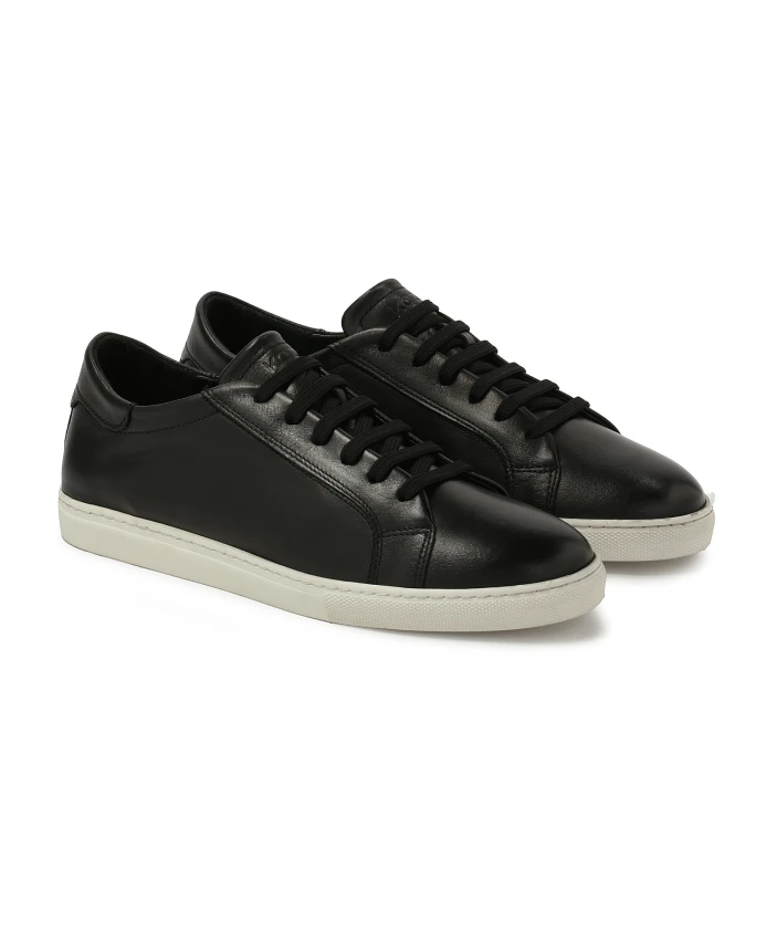 Низкие кроссовки на шнуровке из черной натуральной кожи - идеальное сочетание классики и современности. Минималистичный верх без лишних деталей придает им элегантный и утонченный вид. Простая белая подошва контрастирует с черным цветом, добавляя легкости и свежести. Благодаря точному мастерству и использованию натуральной кожи, эти кроссовки не только стильные, но и прочные и удобные. Их универсальность делает их идеальными для повседневной и полуформальной одежды, излучая вневременную элегантность и сдержанный шик. Внутренняя часть обуви отделана мягкой натуральной кожей.