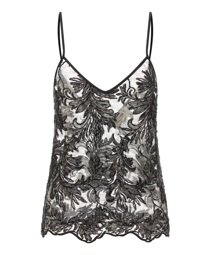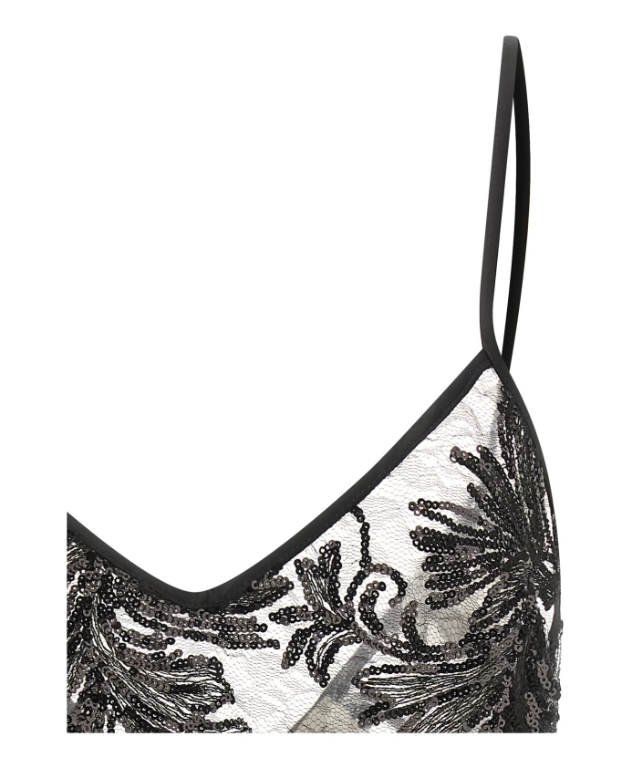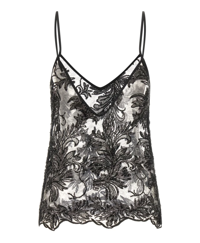 Топ LE TWINS Alba - это полупрозрачный кружевной топ, сочетающий в себе изящные аппликации из пайеток с современным асимметричным подолом. Широкий V-образный вырез (спереди и сзади) и тонкие бретельки делают его превосходным выбором для вечерних образов и многослойности. Ключевые особенности: Черный | Полиэстер | Тонкие бретельки | Полупрозрачное кружево | Аппликации из пайеток | Широкий V-образный вырез спереди и сзади | Асимметричный подол | Размер и посадка: Соответствует размеру | Состав материала и уход: 100% полиэстер | Следуйте инструкциям производителя по уходу.