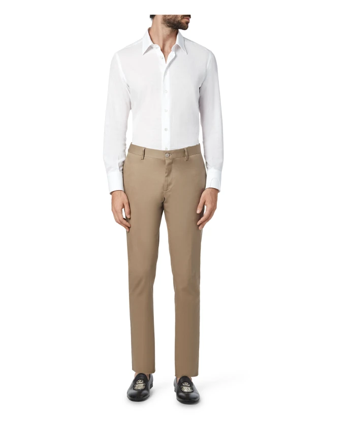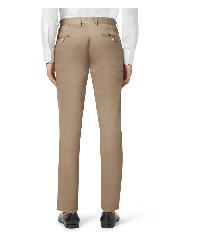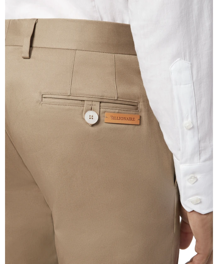 Брюки-чинос «Миллиардер» коричневого цвета, сшитые из эластичного хлопкового габардина для комфорта в течение всего дня. Узкий силуэт сочетает в себе классические детали чинос с изысканной отделкой. Ключевые особенности: Коричневый | Хлопковый габардин | Эластичный материал | Два передних кармана | Два прорезных кармана на пуговицах сзади | Застежка на одну пуговицу с логотипом | Кожаная нашивка с логотипом под правым задним карманом | Стиль чинос | Плоский перед | Размеры и посадка: Низ штанин: 18 см | Узкий крой | Состав и уход: Эластичный хлопковый габардин