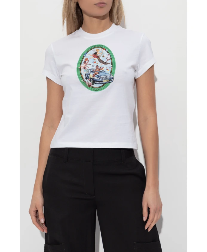 Представляем футболку Off-White с логотипом - идеальное сочетание элегантности и авангардного стиля. Эта модель украшена захватывающим изображением херувима на автомобиле, окруженного розами, сферами и орлом, на гладком, высококачественном белом хлопке. Ключевые особенности: Off-White | Белый | Хлопок | Классический, приталенный крой | Яркий дизайн с херувимом и автомобилем | Зеленая кайма с надписью «2013» | Размеры и крой: Классический, приталенный крой | Состав и уход: 100% хлопок | Машинная стирка в холодной воде, сушка в барабане при низкой температуре