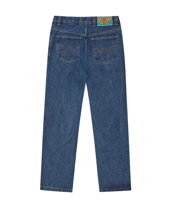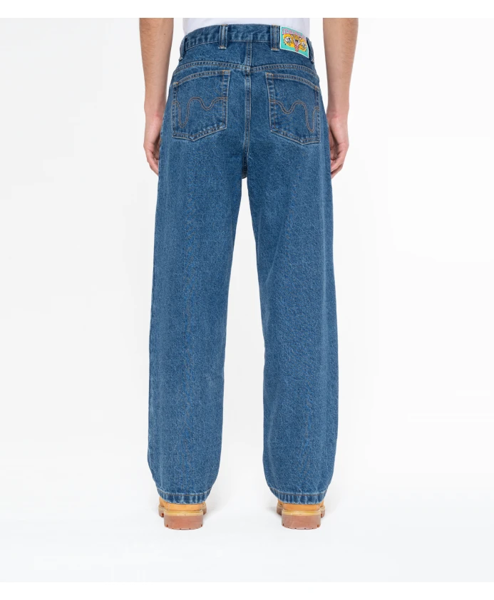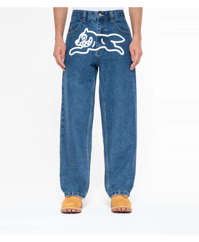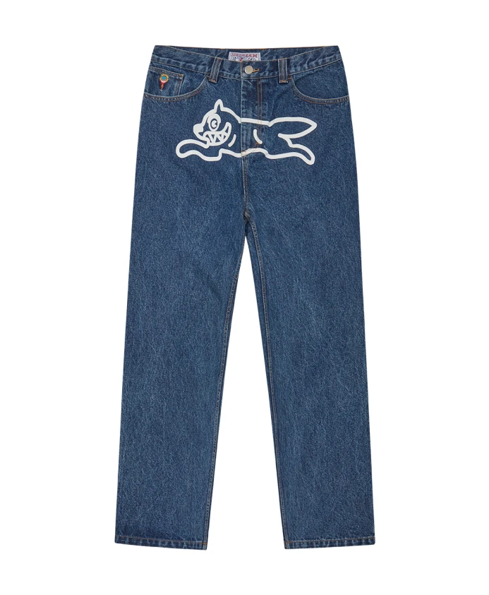 ICECREAM - Мужские джинсы с двойным вырезом и изображением бегущей собаки. На передней части - трафаретная печать с изображением бегущей собаки, на кармане для мелочи - вышитый логотип с двойным вырезом, на задних карманах - декоративная отделка в виде капель. Застежка на молнию. Джинсовая ткань среднего синего цвета, стандартный крой, прямые штанины. Трафаретная печать с изображением бегущей собаки на передней части и вышивка в виде капель на задних карманах. Застежка на молнию. 100% хлопок. Размер: Свободный крой. Модель ростом 185 см и носит размер 30.