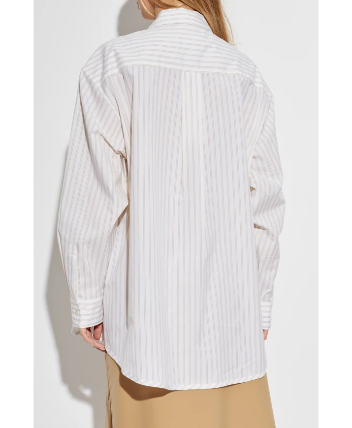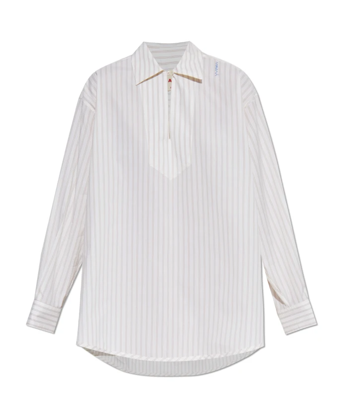 Представляем полосатую рубашку оверсайз от Marni, изготовленную из высококачественного хлопка, сочетающего элегантность и комфорт. Свободный крой и изысканный дизайн делают эту рубашку идеальной для формальных и полуформальных мероприятий. Ключевые особенности: Белый | Бежевый | Хлопок | Дышащая ткань | Длинные рукава с манжетами | Классический воротник | Деликатная застежка на пуговицы | Уникальная синяя вышивка на плече | Размеры и посадка: Оверсайз | Состав и уход: 100% хлопок | Машинная стирка в холодной воде, сушка в барабане при низкой температуре.