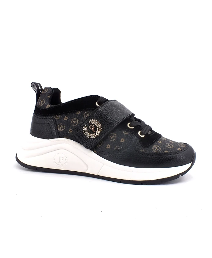 Кроссовки Pollini Heritage сочетают в себе ремешок с логотипом, скрытую внутреннюю танкетку высотой 7 см и резиновую подошву, создавая стильную повседневную обувь. Ключевые особенности: Черный | Экопелле | Прочная резиновая подошва | Шнуровка спереди | Застежка на ремешке | Петля сзади | Резиновая подошва | Ремешок с логотипом и металлическим лавровым листом | Принт с логотипом Heritage (по всей поверхности) | Круглый носок | Размеры и посадка: Высота внутренней танкетки: 7 см | Состав и уход: Верх: Экопелле | Подкладка: Кожа | Подошва: Резина