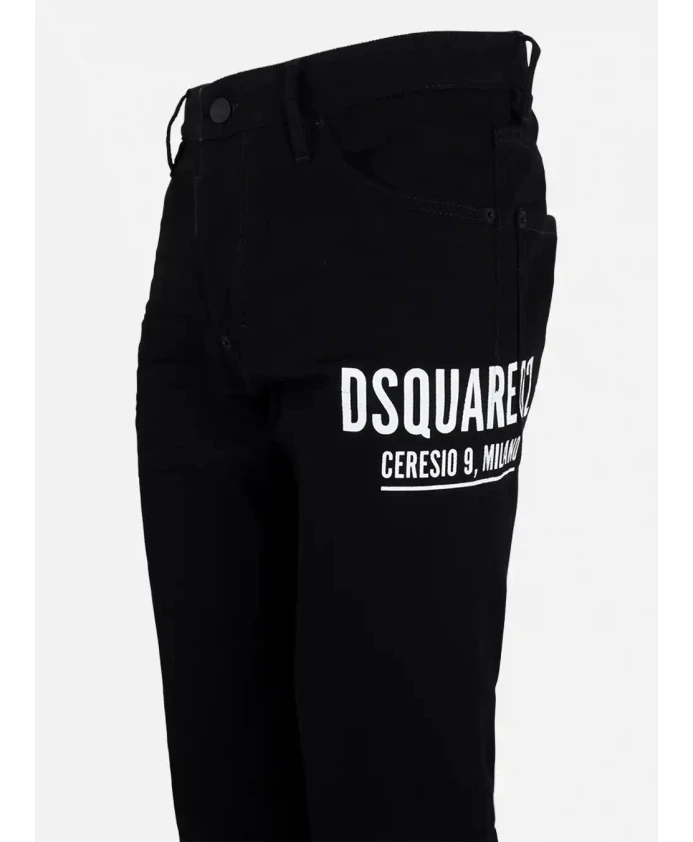 Джинсы Dsquared2 зауженного кроя из черного денима с пятью карманами, белым принтом "Ceresio 9 Milano" на бедре и нашивкой с логотипом сзади. Простые, универсальные джинсы на каждый день с зауженным кроем и классическими деталями. Ключевые особенности: Черный | Хлопок | Застежка на пуговицу и молнию | Шлевки для ремня | Кожаная нашивка с логотипом сзади | Пять карманов | Белый принт "Ceresio 9 Milano" на бедре | Нашивка с логотипом сзади | Полностью черный цвет | Размеры и посадка: Стандартный крой | Состав ткани и уход: 98% хлопок, 2% эластан