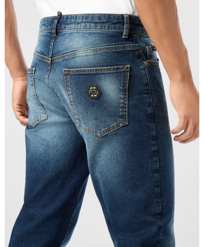Джинсы Philipp Plein Straight Supreme Fit сочетают в себе классический дизайн с пятью карманами и фирменные детали Plein. Джинсовая ткань с эффектом потертости и прямой крой Supreme создают структурированный вариант джинсов для повседневной носки. Ключевые особенности: Синий | Термочувствительные вставки | Джинсовая ткань | Дизайн с 5 карманами | Одна металлическая пуговица | Потертость | Логотип на спине | Фирменные детали Plein | Размеры и посадка: Прямой крой Supreme | Состав ткани и уход: 99% хлопок, 1% эластан | 65% полиэстер, 35% хлопок
