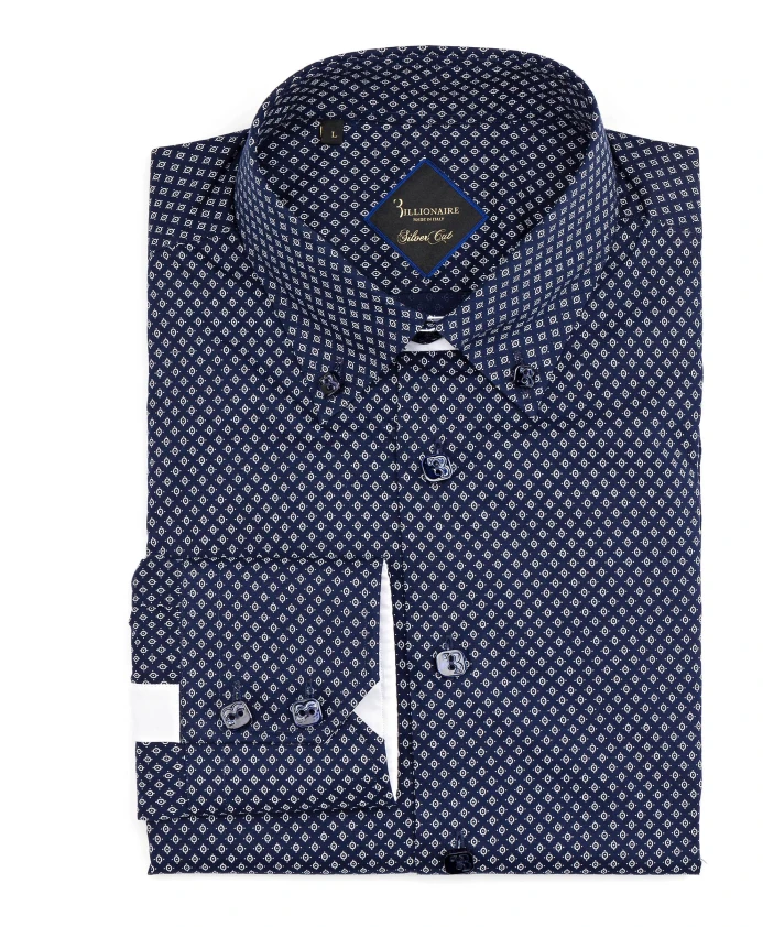 Рубашка Billionaire Slim Fit - это рубашка из эластичного поплина с принтом по всей поверхности и контрастными деталями, созданная для изысканного образа в стиле smart-casual. Эластичная ткань и приталенный крой делают ее подходящей как для официальных, так и для повседневных случаев. Ключевые особенности: Синий | Средне-синий | Эластичный поплин | Эластичность | Квадратные перламутровые пуговицы | Вытачки на спине | Принт по всей поверхности | Контрастные детали | Воротник на пуговицах | Размеры и посадка: Приталенный крой | Серебристый крой