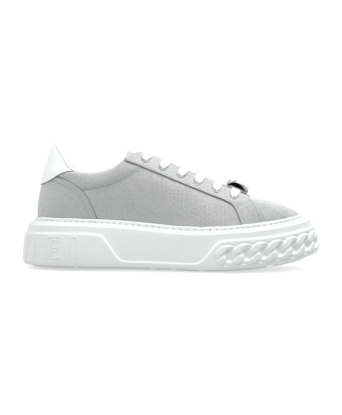 Откройте для себя элегантные кроссовки с мерцающими блестками от Casadei, бренда, известного своим итальянским мастерством с 1958 года. Эти кроссовки отличаются эффектным серебристым цветом и низким дизайном, сочетающим современность с классическим стилем. Ключевые особенности: Серебристый | Серый | Кожа | Ткань | Массивная белая подошва с рисунком в виде цепочки | Прямоугольный декоративный элемент на шнурках | Эксклюзивный логотип дизайнера внутри | Размер и посадка: Стандартная посадка | Состав и уход: Кожа | Ткань | Чистить мягкой тканью