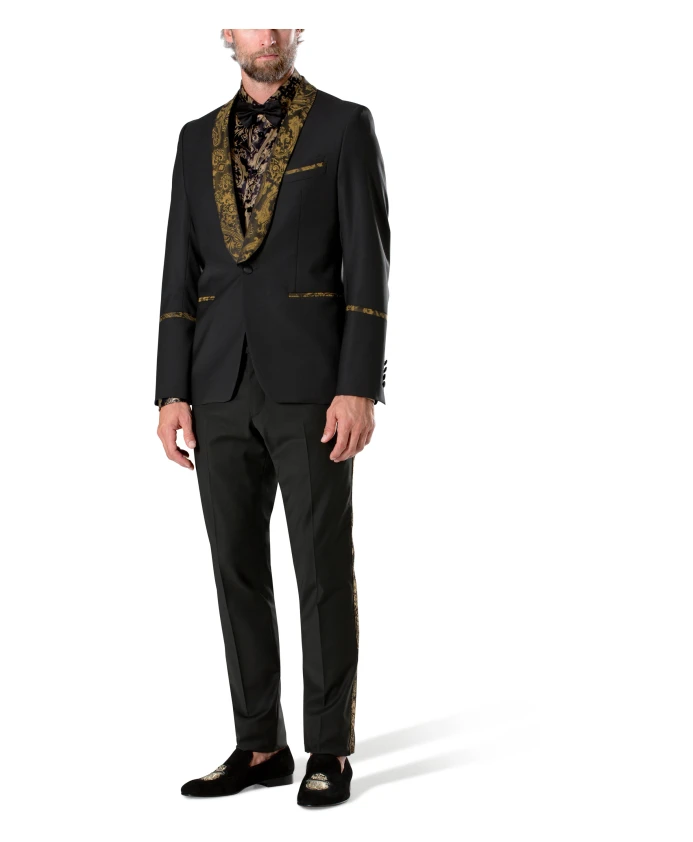 Вечерние брюки Billionaire Flat Front сочетают в себе изысканный крой и эффектные шелковые детали, идеально подходящие для торжественных случаев и вечерних мероприятий. Дизайн включает жаккардовые боковые полосы и вышитый герб на заднем кармане. Ключевые особенности: Черный | Золотой | Шерсть | Два передних кармана | Два задних кармана | Плоский перед | Жаккардовые боковые полосы из шелка | Пуговицы, обтянутые шелковым атласом | Вышитый герб на правом заднем кармане | Размеры и посадка: Стандартный крой | Состав ткани и уход: Шерсть | Шелк