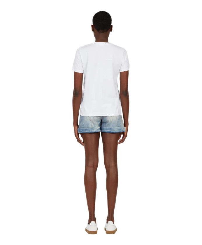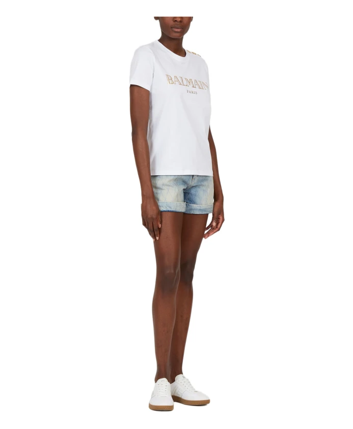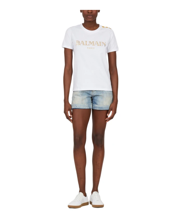 Футболка Balmain с логотипом на пуговицах - это хлопковая футболка, сочетающая классический круглый вырез и фирменные пуговицы на плечах для создания изысканного повседневного образа. Она предназначена для комфортной носки и имеет заметный логотип на передней части для мгновенной узнаваемости бренда. Ключевые особенности: Белый | Хлопок | Пуговицы на левом плече | Круглый вырез | Короткие рукава | Логотип на передней части | Детали в виде золотистых пуговиц на плече | Размеры и посадка: Свободный крой | Состав ткани и уход: 100% хлопок