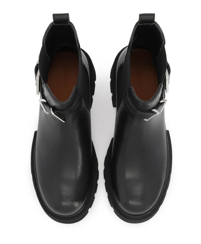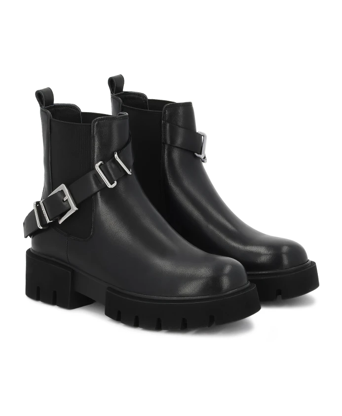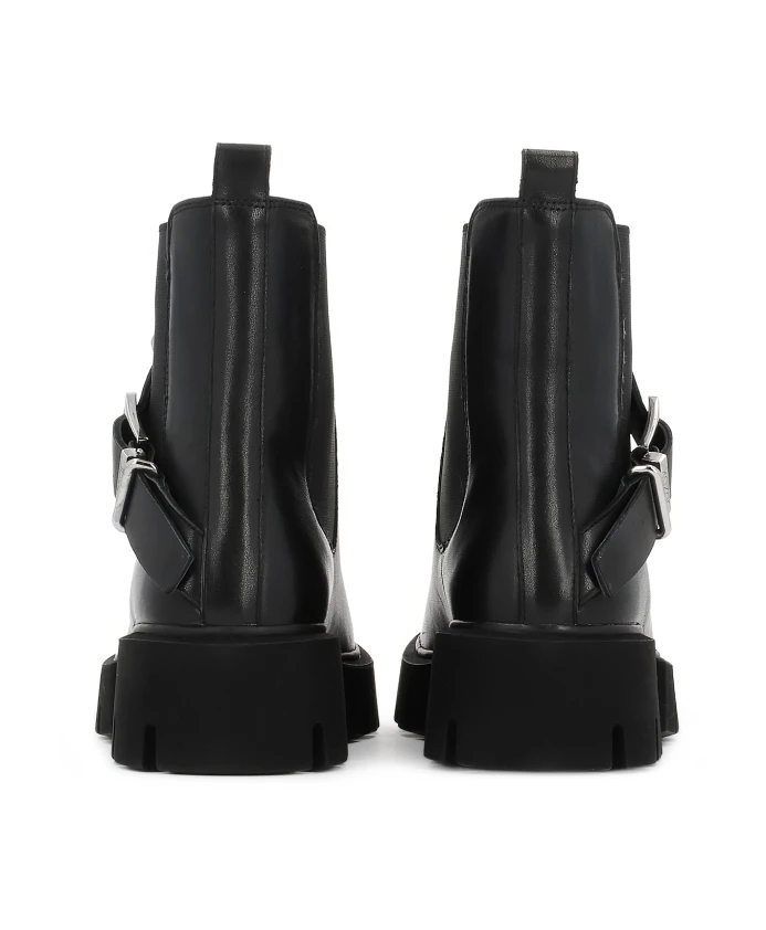 Современные ботинки без шнурков, изготовленные из высококачественной натуральной кожи, отличаются прочностью и элегантным внешним видом. Ботинки имеют эластичные боковые вставки, благодаря которым их легко надевать и они идеально сидят на ноге. Декоративный ремешок с металлическими пряжками добавляет яркий, модный штрих. Массивная подошва типа "трактор" обеспечивает комфорт и сцепление, идеально дополняя современные городские тренды. Подкладка выполнена из мягкой полуанилиновой овчины, обеспечивающей исключительный комфорт при ходьбе.