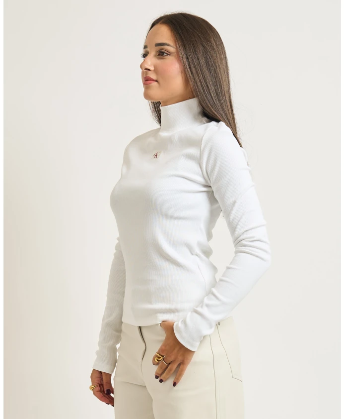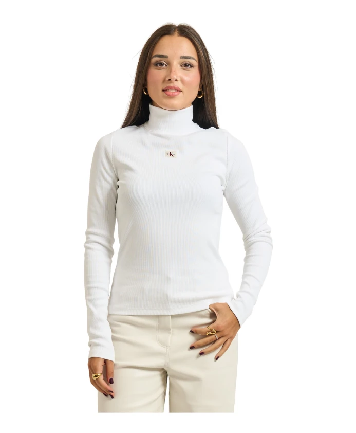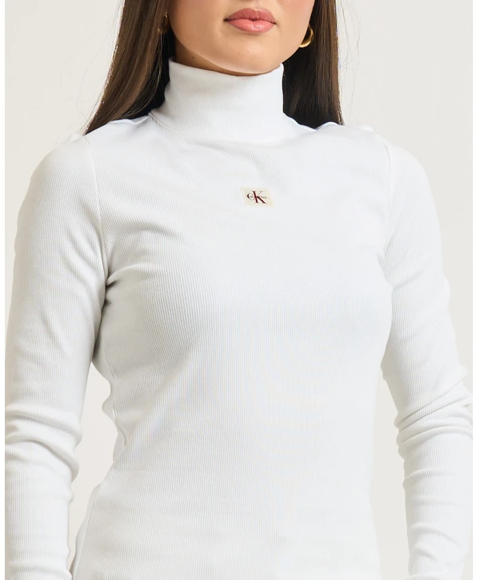 Топ Calvin Klein из ребристого хлопка с высоким воротником сочетает в себе тонкую ребристую эластичную вязку и облегающий силуэт, идеально подходящий для многослойной одежды. Он создан для повседневной носки и комфортного ношения под куртками и жилетами. Ключевые особенности: Белый | Хлопок | Эластичная ткань (Lycra FREEF!T) | Логотип на груди | Легко сочетается с другой одеждой | Высокий воротник | Тонкая ребристость | Длинные рукава | Состав и уход: 94% хлопок | 6% эластан | Машинная стирка; сушка в сушилке при низкой температуре.