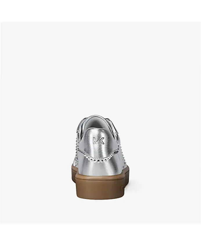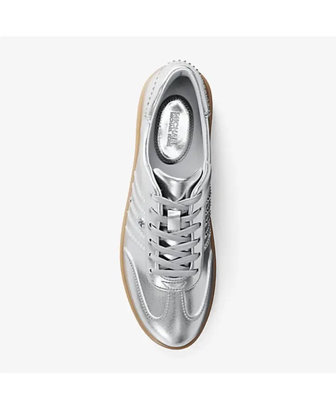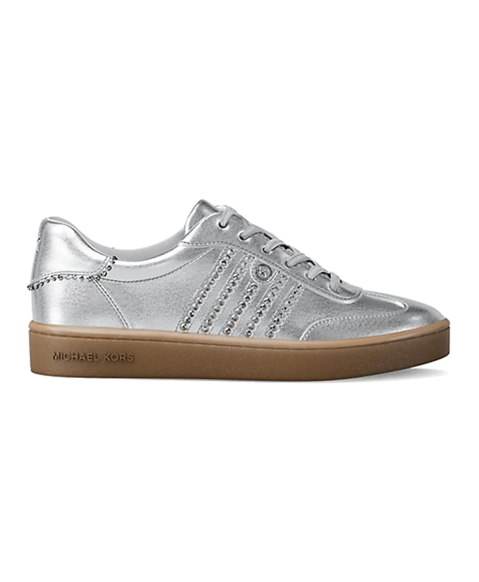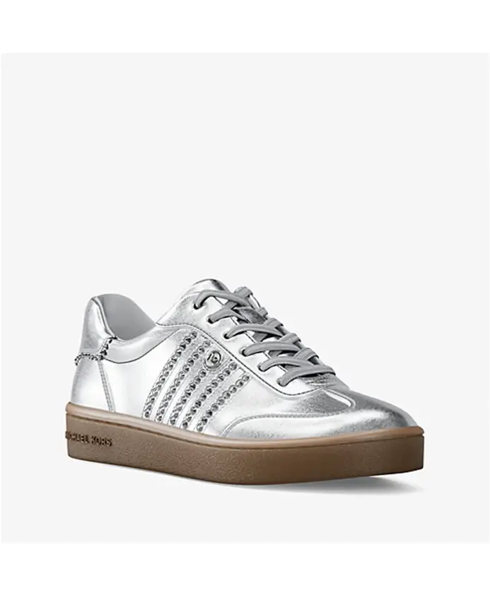 Кроссовки Michael Kors Scotty - стильные низкие кроссовки из металлизированной кожи с декоративными заклепками и подвеской с логотипом. Небольшая платформа и миндалевидный носок делают их универсальной повседневной моделью, легко сочетающейся со светлыми джинсами. Ключевые особенности: Серебристый цвет | Металлизированная кожа | Шнуровка | Декоративные заклепки | Подвеска с логотипом | Миндалевидный носок | Размеры и посадка: Высота платформы: 3,2 см | Материал и уход: Металлизированная кожа | Хлопковая подкладка | Резиновая подошва