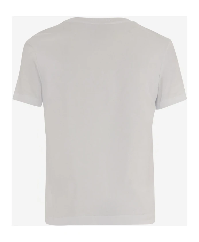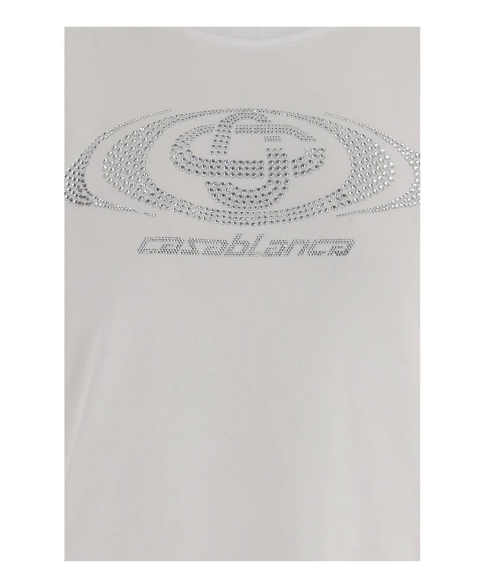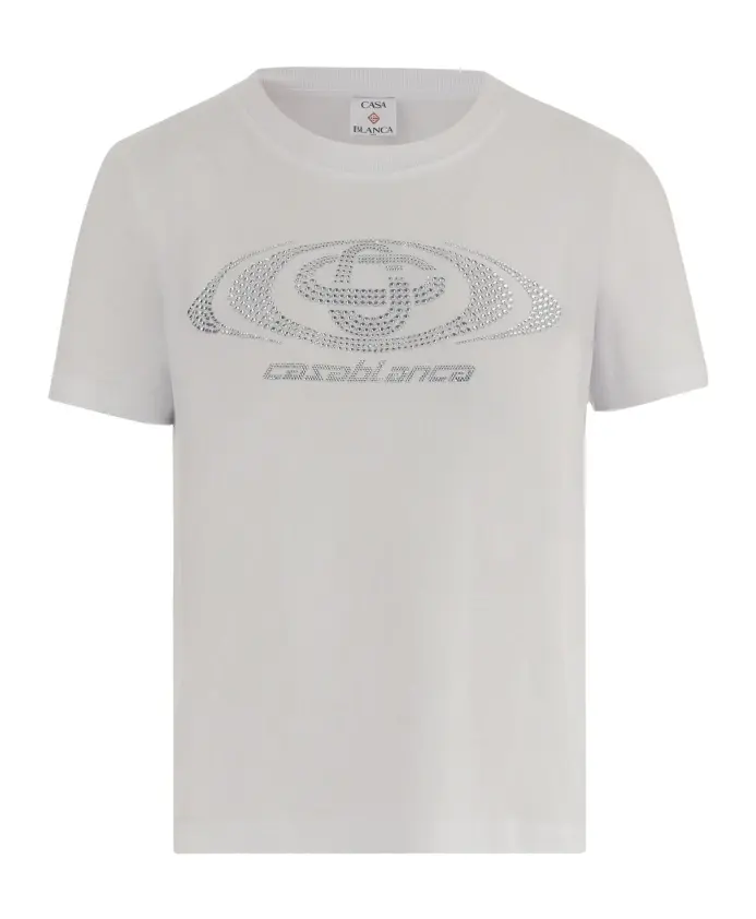 Футболка Casablanca украшена логотипом спереди, декорированным стразами, что придает ей утонченный и изысканный вид. Изготовлена в Португалии из хлопка, имеет простой силуэт с круглым вырезом, идеально подходящий для повседневной носки. Ключевые характеристики: Белый | Хлопок | Круглый вырез | Короткие рукава | Логотип спереди, украшенный стразами | Прямой низ | Размеры и посадка: Модель носит размер S | Рост: 175 см | Обхват груди: 86,5 см | Обхват талии: 65 см | Обхват бедер: 92 см | Ширина плеч: 40 см | Состав и уход: 100% хлопок