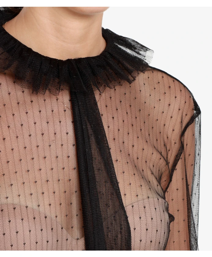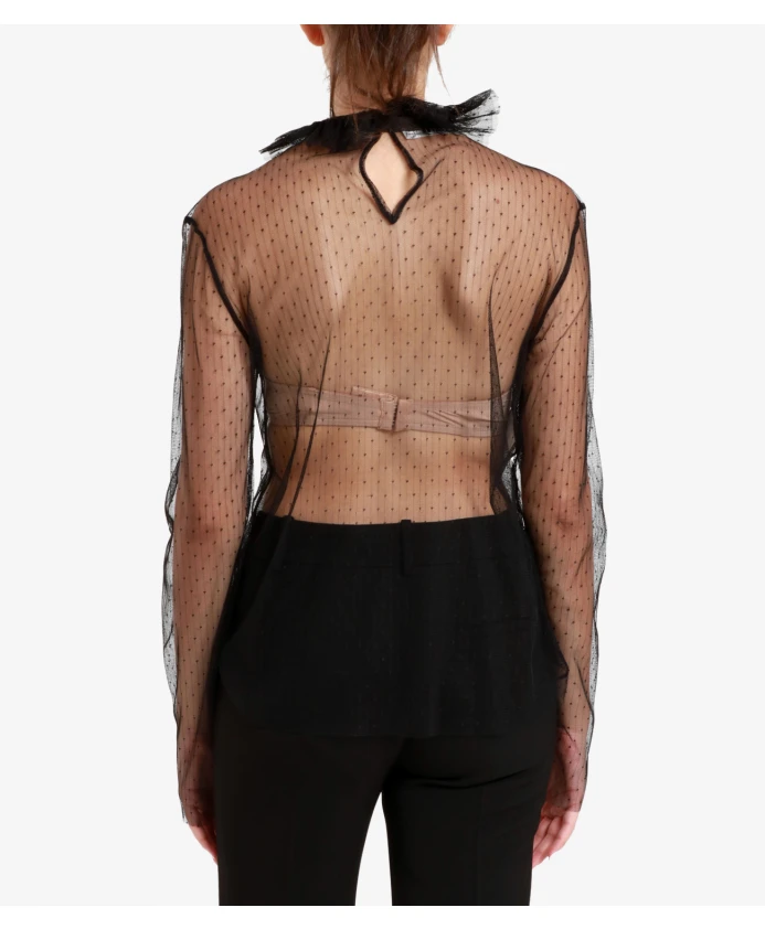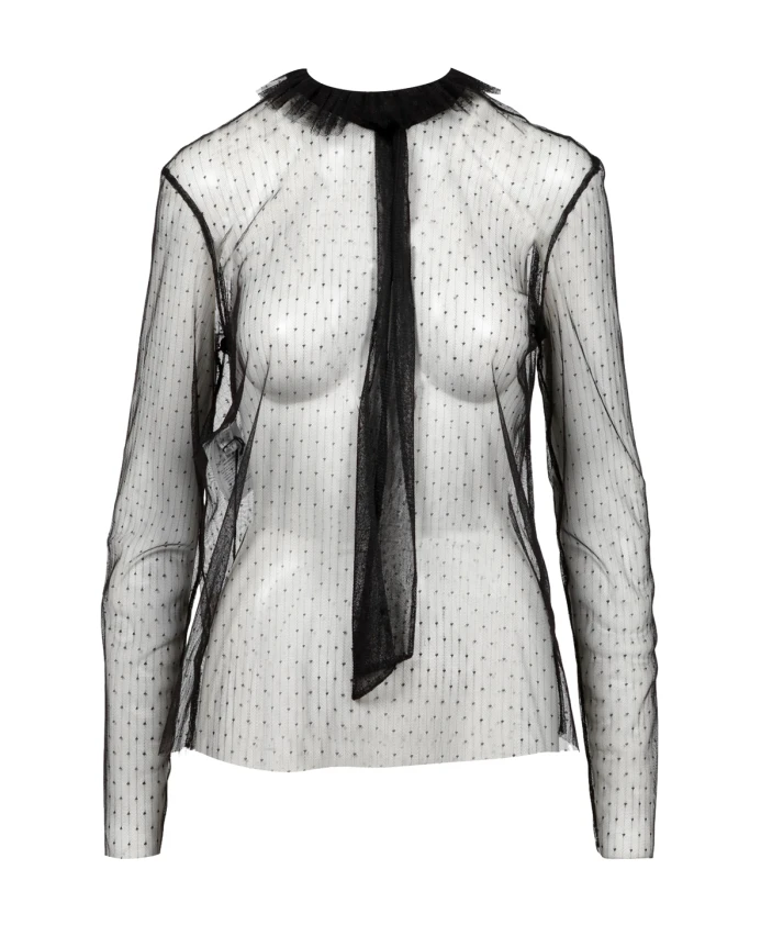 Тюлевая блузка от Philosophy di Lorenzo Serafini сочетает в себе вышитый тюль в горошек с двойным воротником-рюшами и свисающим шарфом, создавая романтичную, привлекательную модель, подходящую для торжественных случаев. Ключевые особенности: Черный | Тюль | Свисающий шарф на воротнике | Вышитый узор в горошек | Воротник с двойной оборкой и свисающим шарфом | Очень длинные рукава с необработанными краями | Прямой низ с необработанной отделкой | Размеры и посадка: Длина до бедра | Стандартный крой | Состав и уход: Только химчистка