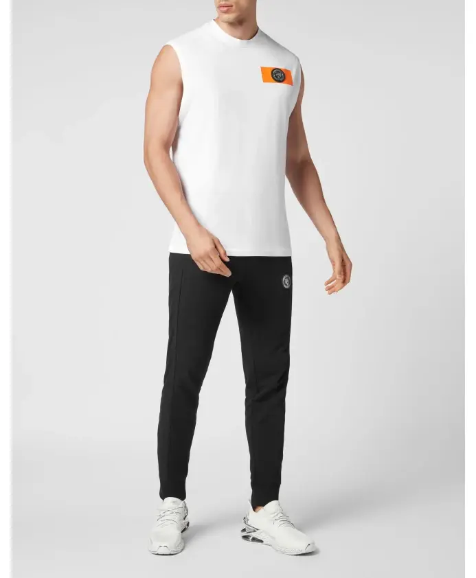 Спортивная майка Plein сочетает спортивный стиль с повседневным комфортом. Она украшена прорезиненной нашивкой с изображением тигра и изготовлена из хлопкового трикотажа для гибкости и комфорта при ношении. Ключевые особенности: Белый | Хлопок | Комфортный | Гибкий хлопковый трикотаж | Двойная строчка по низу | Без рукавов | Ребристый трикотажный воротник | Прорезиненная нашивка с изображением тигра на левой стороне груди | Контрастная окантовка по краю груди | Размеры и посадка: Свободный крой | Состав ткани и уход: 100% хлопок