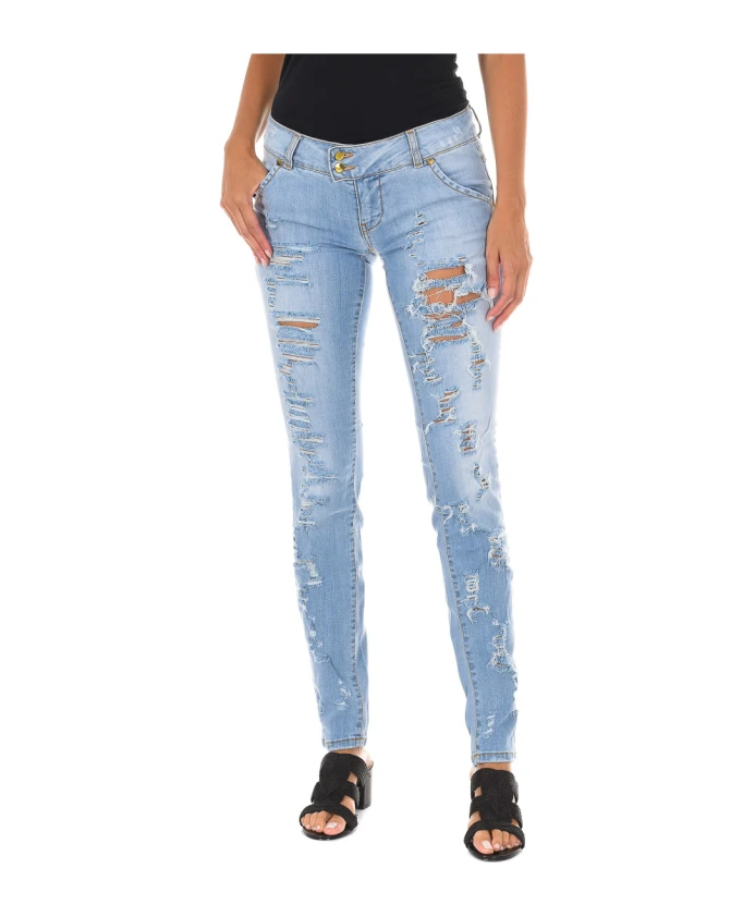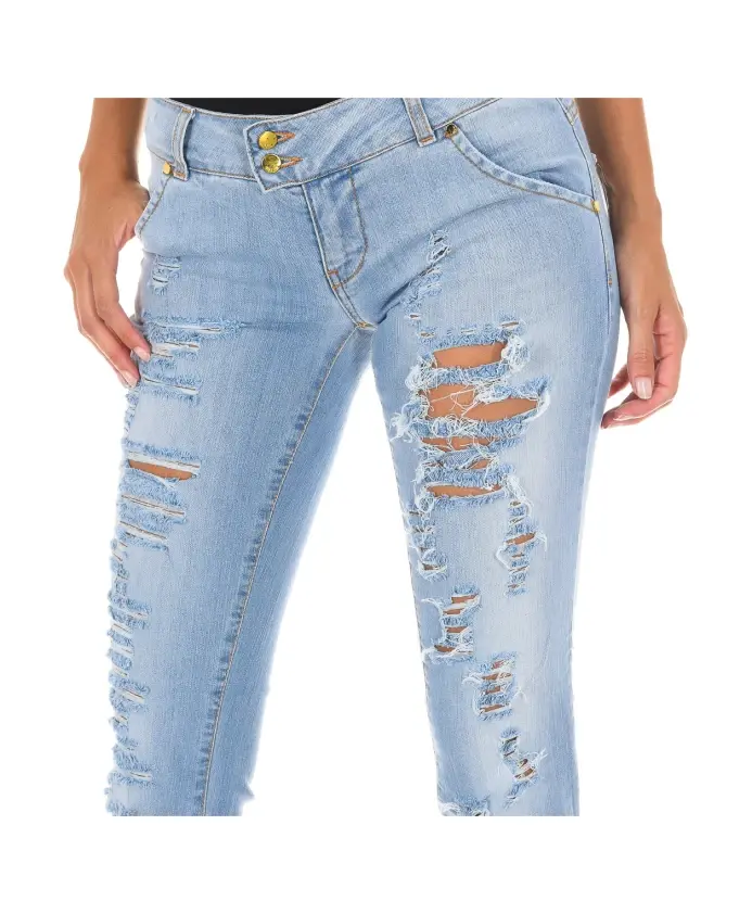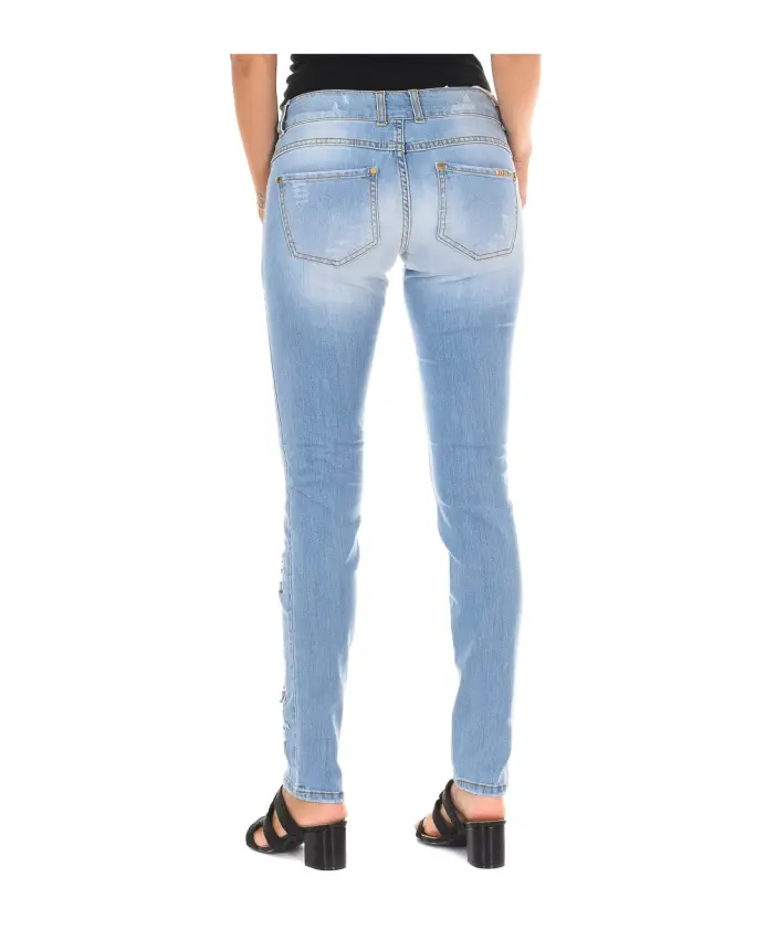 Джинсы-скинни MET для женщин. Длинные джинсовые брюки с петлями для ремня, застежкой на пуговицу и молнию спереди. Два передних кармана и два открытых задних кармана с металлизированным логотипом бренда. Зауженный крой с эффектом потертости и рваных краев. Эластичная ткань с видимыми швами в тон. Состав: 91% хлопок - 8% полиэстер - 1% эластан. Инструкции по уходу: - Машинная стирка при температуре до 40°C. - Гладить при средней температуре, максимум 110°C. - Сушить в сушильной машине. - Не отбеливать. - Не подвергать химчистке.