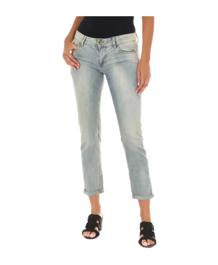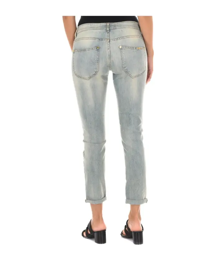 Женские укороченные джинсы MET. Длинные джинсы с петлями для ремня, застежкой на пуговицу и молнию спереди. Два передних кармана и один небольшой карман. Два открытых задних кармана с металлизированной надписью бренда. Зауженный крой с эффектом потертости. Эластичная ткань с видимыми швами в тон. Состав: 91% хлопок, 8% полиэстер, 1% эластан. Инструкции по уходу: - Машинная стирка при температуре до 40°C. - Гладить при средней температуре, максимум 110°C. - Сушить в сушильной машине. - Не отбеливать. - Не подвергать химчистке.