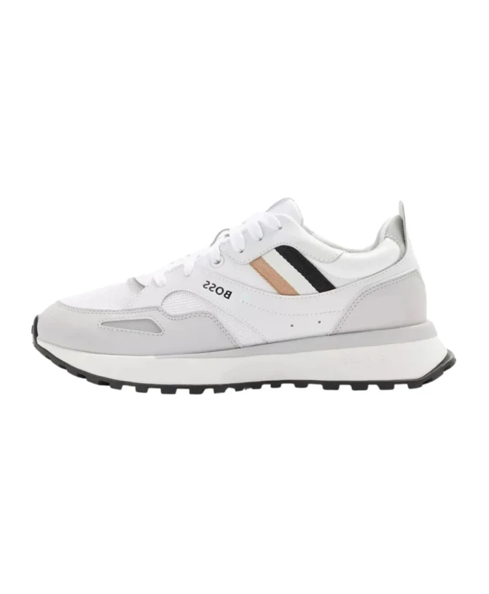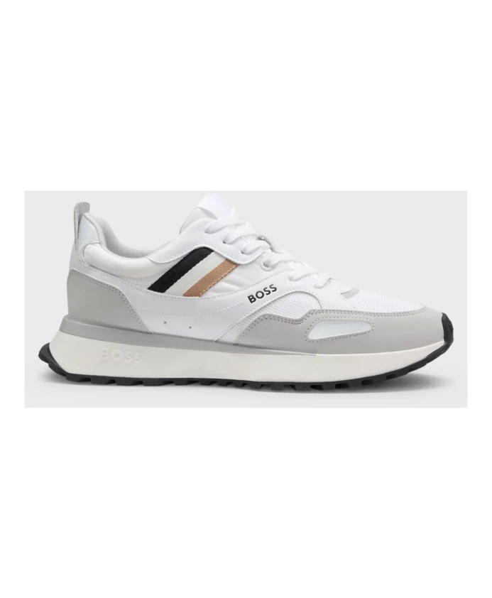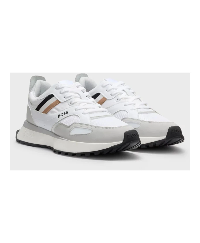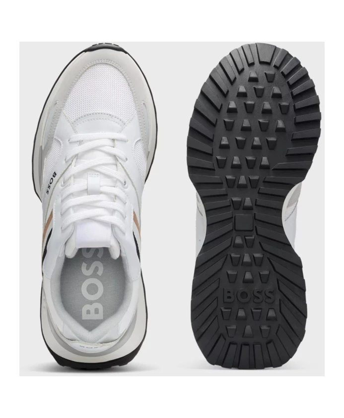 Подчеркните свой стиль с помощью этих спортивных кроссовок BOSS с фирменной полосатой отделкой бренда. Изготовлены из сочетания различных текстур, включая сетку и синтетическую ткань с покрытием. Полностью на подкладке, со шнуровкой. Состав материала: 55% полиуретан, 45% полиэстер; Подкладка: 85% полиэстер, 54% вискоза (бамбуковая целлюлоза), 46% полиэстер; Подошва: 70% этиленвинилацетат, 30% резина; Отделка: 100% полиэстер, 64% переработанная кожа, 36% полиуретан; Стелька: 54% вискоза (бамбуковая целлюлоза), 46% полиэстер.