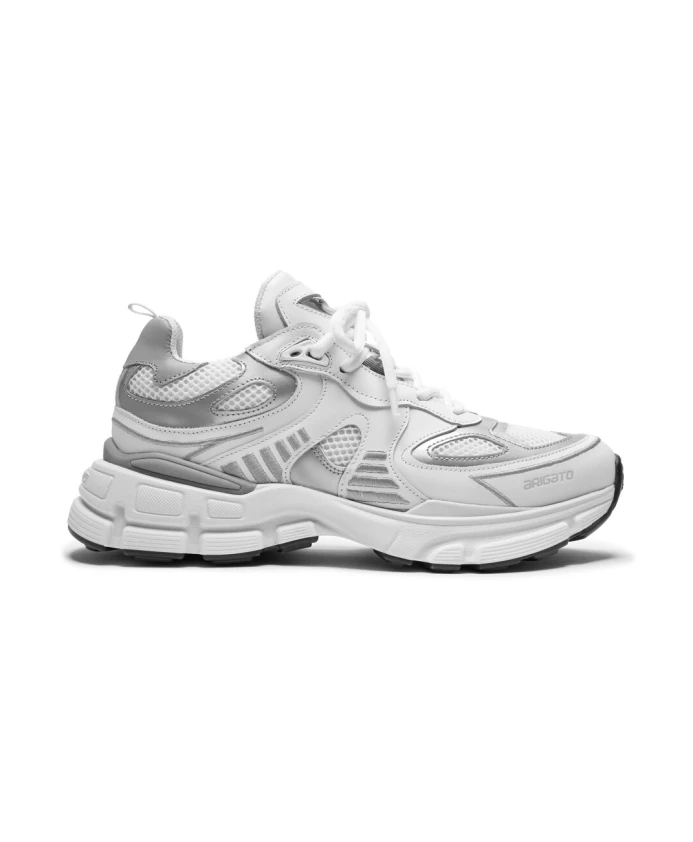 Поднимите свой стиль на новый уровень с этими белыми и серебристыми низкими кроссовками Axel Arigato 'Sphere Runner'. Изготовленные вручную из изогнутых панелей высококачественной кожи, сертифицированной LWG, замши и сотовой сетки, эти кроссовки имеют светоотражающие элементы, язычок с логотипом из ТПУ и массивную подошву для дополнительного стиля и комфорта. Идеально подходят для модниц. Высота каблука: 3,5 см; высота носка: 2,5 см. Материал верха: 70% кожа, 30% полиэстер; подкладка: 100% полиэстер; подошва: 100% TR.