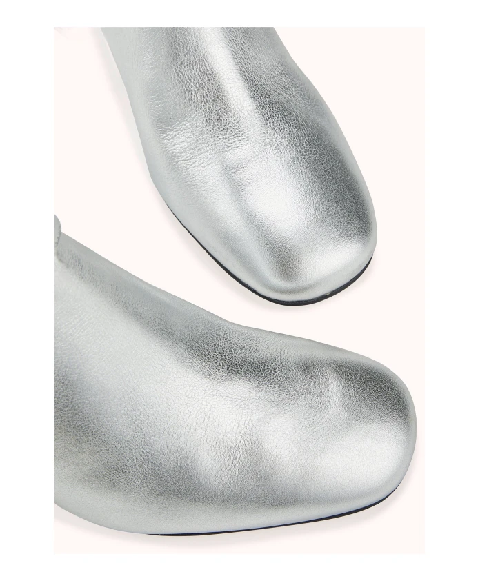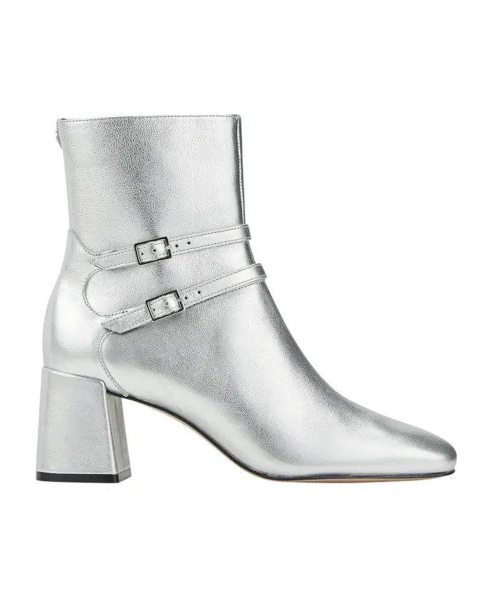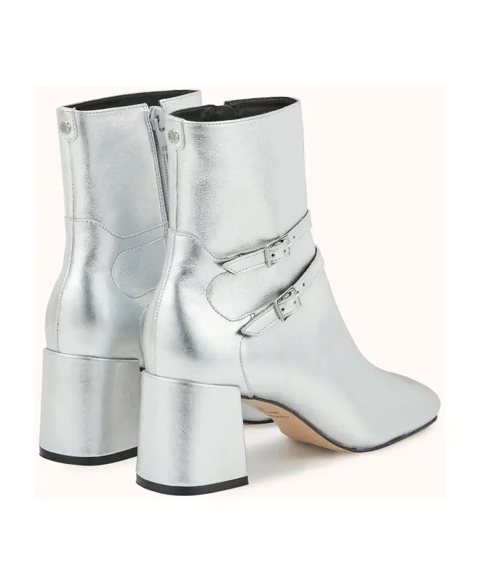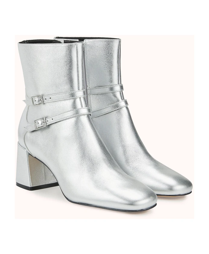 Подчеркните свой стиль с помощью этих белых ботильонов на каблуке, слегка расширяющихся книзу и обеспечивающих комфорт в течение всего дня. Изготовленные из серебристой металлизированной кожи и украшенные двумя тонкими серебристыми ремешками с пряжками, эти ботильоны станут ярким дополнением к вашему гардеробу. Ключевые особенности: Серебристый | Серый | Серебристая металлизированная кожа | Слегка расширяющийся книзу массивный каблук | Два тонких серебристых ремешка с пряжками | Размер и посадка: Комфортная посадка