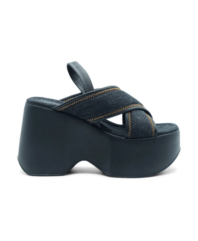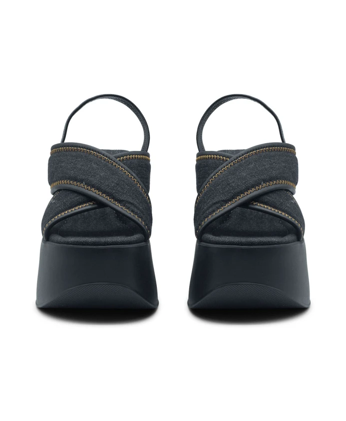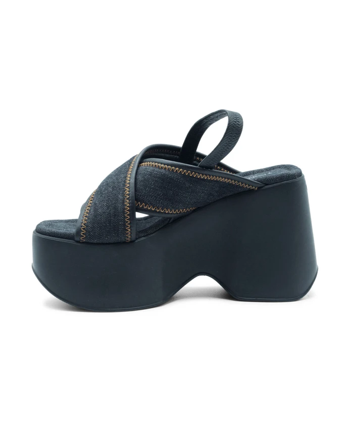 Черные джинсовые тапочки Yoko, состоящие из двух слегка уплотненных джинсовых ремешков, отделанных кожей и украшенных контрастной зигзагообразной строчкой; эластичная кожаная подкладка для дополнительной устойчивости. Танкетка из сверхлегкого, удобного и подобранного по цвету резиноподобного материала с нескользящей подошвой. Мягкая кожаная стелька, украшенная строчкой. Сделано в Италии. Верх: джинсовая ткань / телячья кожа наппа. Состав подошвы: танкетка из ЭВА. Коллекция: весна-лето 2025. Высота каблука: 110 мм.
