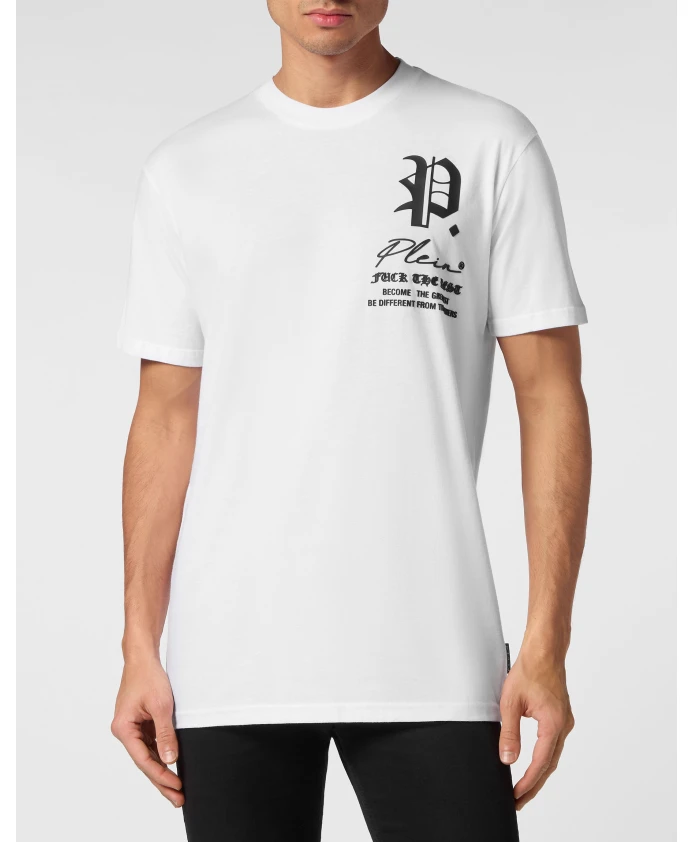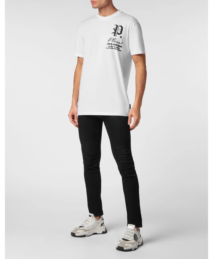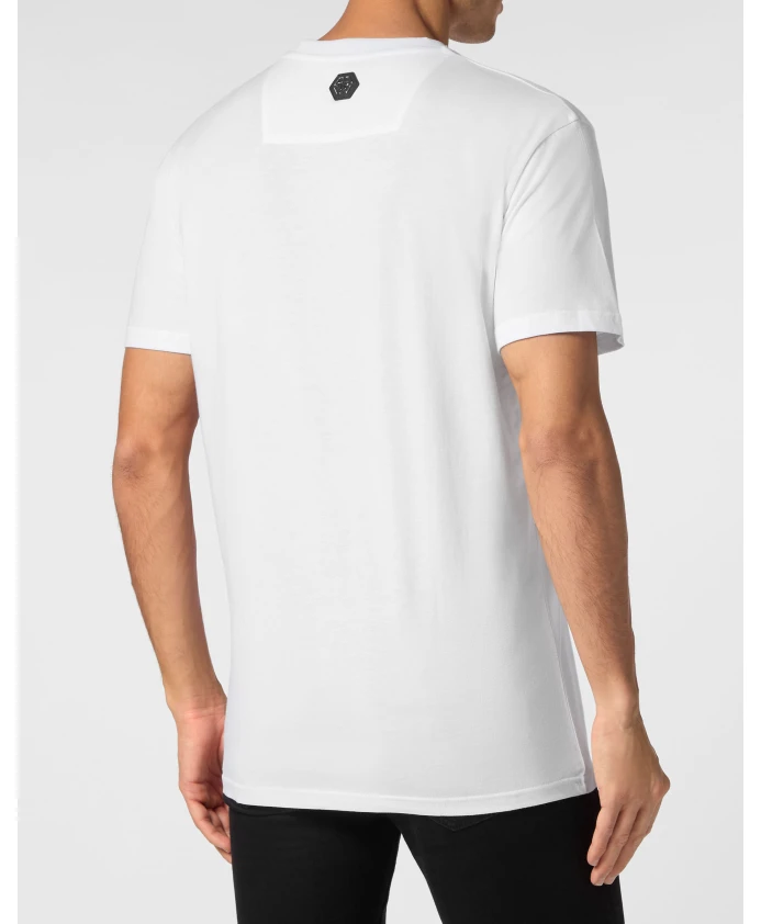 Футболка Philipp Plein Gothic - это футболка из хлопкового трикотажа с круглым вырезом, отличающаяся готическим принтом бренда и шестиугольной нашивкой из сафьяновой кожи на кокетке. Основные характеристики: Белый цвет | Хлопковый трикотаж | Круглый вырез | Ребристый воротник | Готический принт бренда на левой стороне груди | Шестиугольник из сафьяновой кожи, пришитый к нашивке на кокетке | Двойная строчка | Размер и посадка: Стандартный крой | Состав материала и уход: 100% хлопок | Нашивка из сафьяновой кожи