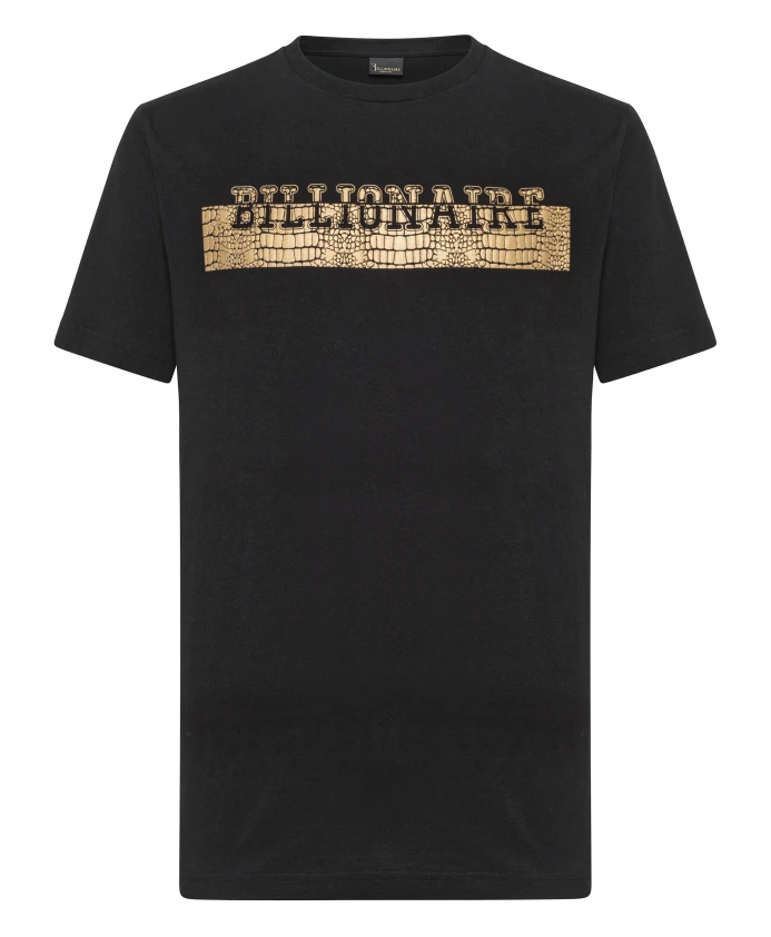 Футболка с круглым вырезом «Миллиардер» из хлопкового трикотажа с принтом под крокодиловую кожу, создающим фактурный и эффектный образ. Модель украшена эмблемой бренда на кокетке и имеет ребристый воротник для аккуратного силуэта. Ключевые особенности: Черный | Хлопок | Двойная строчка на манжетах и подоле | Ребристый круглый вырез | Принт под крокодиловую кожу на передней части | Напечатанная эмблема бренда на кокетке | Напечатанная надпись | Двойная строчка на манжетах и подоле | Состав и уход: 100% хлопок