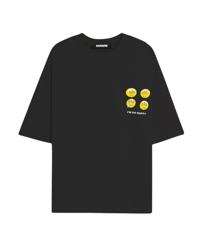 Футболка BARROW Jersey - повседневная хлопковая футболка с привлекательными рисунками в виде смайликов и украшениями со стразами. Создана для отдыха, с яркими принтами спереди и сзади. Ключевые особенности: Черный | Черный | Хлопок | Ребристый круглый вырез | Принт спереди: четыре желтых смайлика с надписью «Я так счастлив» | Принт сзади: плюшевый мишка и культовый мотив смайлика с аппликациями со стразами | Логотип Barrow на спине | Размеры и посадка: Свободный крой | Состав материала и уход: 100% хлопок