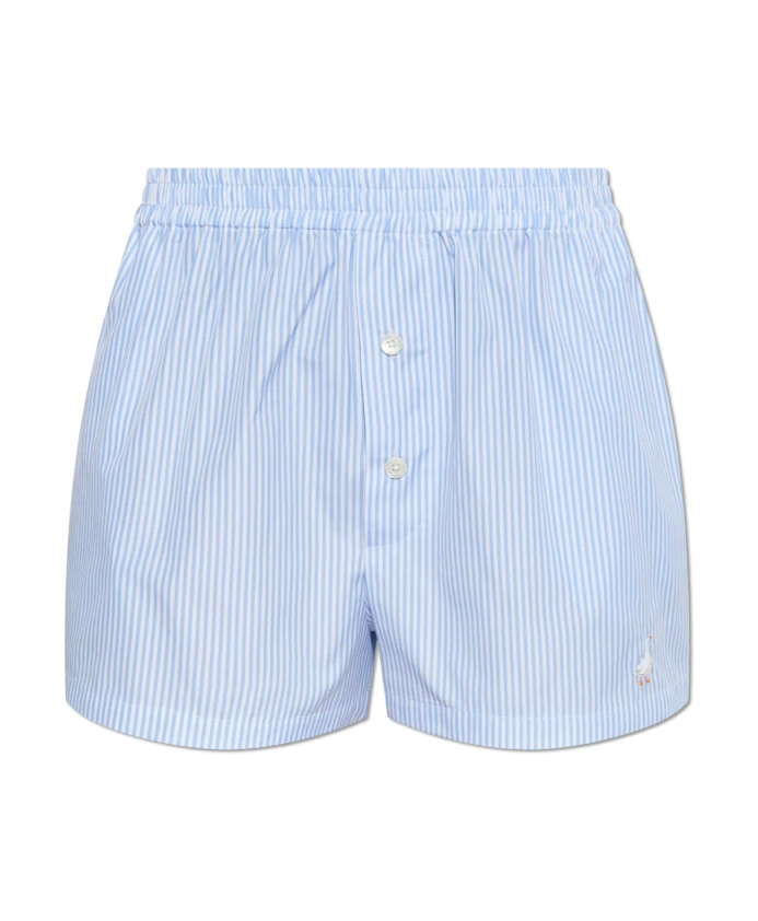 Представляем шорты в стиле нижнего белья из эксклюзивной коллекции Moschino, сочетающие элегантность с ноткой юмора. Свободный, удобный крой с эластичным поясом обеспечивает исключительный комфорт, идеально подходящий для летних дней. Изготовленные из высококачественного 100% хлопка, эти шорты украшены свежим полосатым узором в светло-голубых тонах. Небольшие детали, такие как пуговицы спереди и очаровательный вышитый рисунок гуся на штанине, добавляют им неповторимый характер. На спине нанесена надпись.