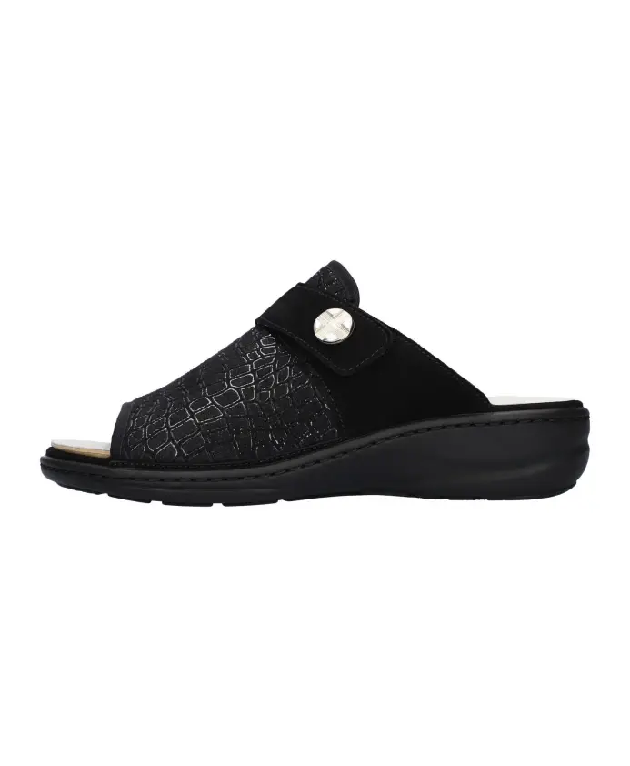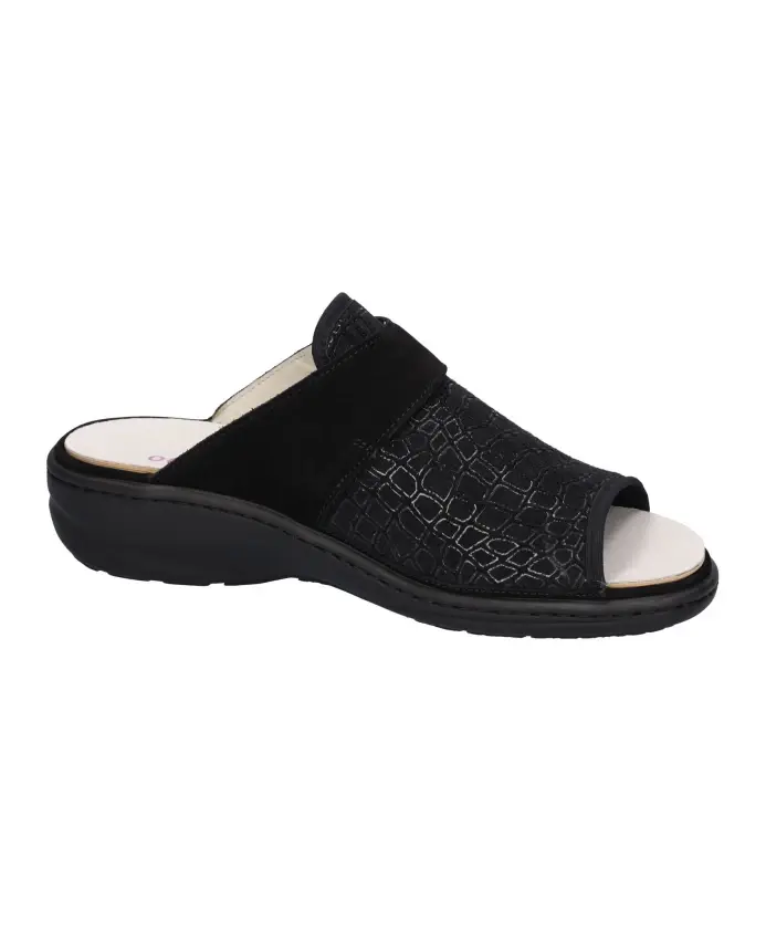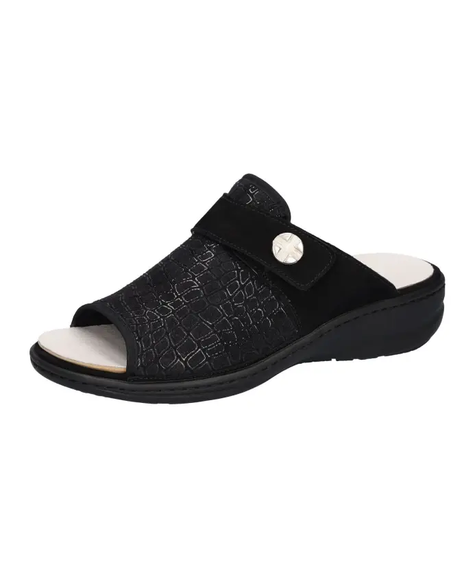 Мюли Waldläufer Heria сочетают в себе поддерживающую конструкцию OrthoTritt с регулируемой застежкой-липучкой и съемной кожаной стелькой для надежного комфорта на каждый день. Ключевые особенности: Черный | Кожа | Гибкая подошва | Поддерживающая, мягкая стелька | Регулируемая застежка-липучка | Съемная стелька | Открытый носок | Танкетка | Низкопрофильный силуэт | Размеры и посадка: Высота каблука: 3 см | Ширина H (широкая посадка) | Материал и уход: Верх: Кожа | Подкладка: Кожа | Подошва: Полиуретан