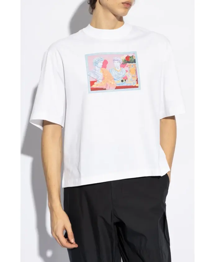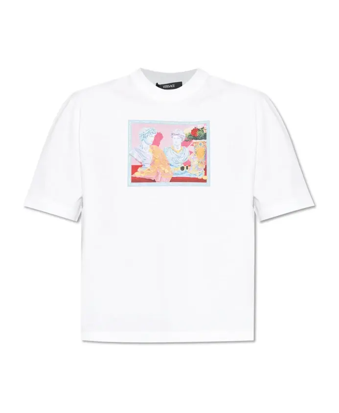 Представляем яркую футболку с принтом, идеально сочетающую элегантность и современность. Созданная иконой моды Версаче, эта белая футболка отдает дань классическому стилю с современным акцентом. Изготовленная из лучшего хлопка, она обеспечивает непревзойденный комфорт и долговечность. Свободный крой и простой силуэт делают ее универсальной вещью в любом гардеробе. На передней части футболки расположен стилизованный принт, окружающий классические линии груди, а также слово «Versatile» (Универсальный).