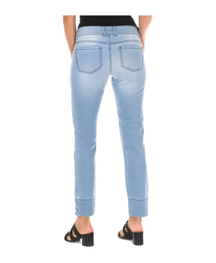 Длинные джинсы из денима от MET для женщин. Модель с петлями для ремня, застежкой на пуговицу и молнию спереди, двумя передними карманами, двумя открытыми задними карманами с металлизированной надписью бренда, зауженным кроем с молниями по низу, эффектом потертости, видимыми швами в тон. Состав: 98% хлопок, 2% эластан. Инструкции по уходу: машинная стирка при температуре до 40°C, глажка при средней температуре до 110°C, сушка в сушилке при низкой температуре, не отбеливать, не подвергать химчистке.