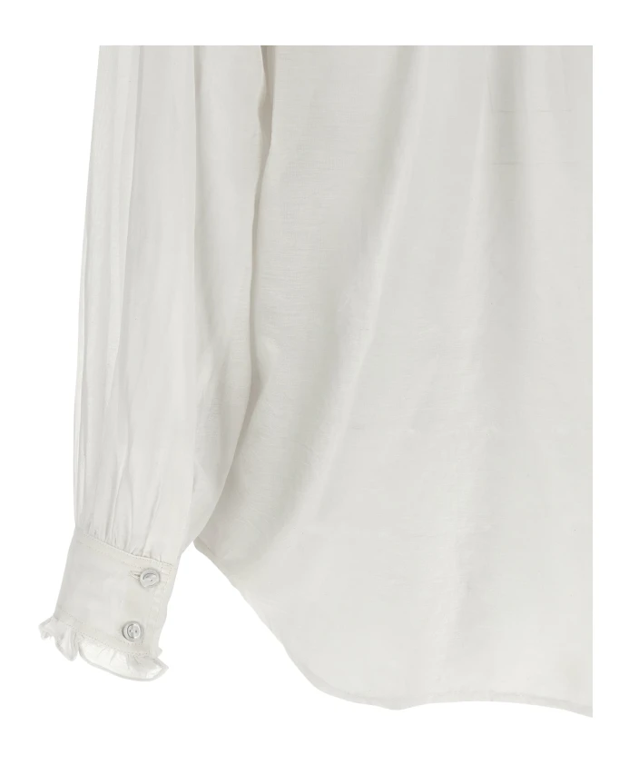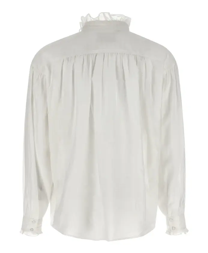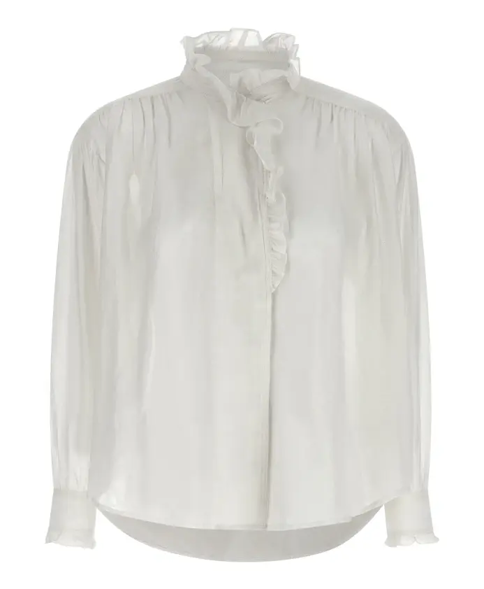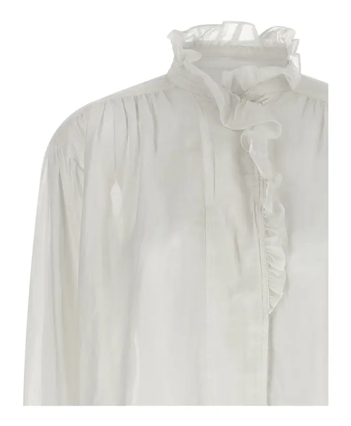 Блузка Marant Étoile Pamias из легкого хлопкового вуаля с оборками и асимметричным воротником. Она сочетает в себе романтические детали и прямой, приталенный крой, создавая изысканный повседневный образ. Ключевые особенности: Белый | Хлопок | Асимметричная застежка на кнопках | Оборки | Асимметричный воротник | Детали на плечах | Длинные рукава с манжетами | Прямой крой | Размеры и посадка: Прямой крой | Соответствует размеру (французские размеры) | Состав ткани и уход: 80% хлопок | 20% вискоза
