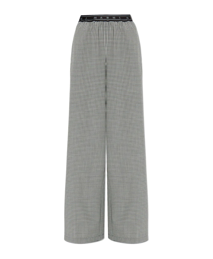 Откройте для себя широкие клетчатые брюки Marni - стильное дополнение к любому гардеробу. Эти брюки имеют свободный, широкий крой, идеально подходящий для повседневной носки. Ключевые особенности: Черный | Полиэстер | Шерсть | Эластан | Эластичный пояс с логотипом | Два функциональных кармана | Широкие штанины | Черно-белый клетчатый узор | Размеры и посадка: Свободный крой | Состав и уход: Полиэстер | Шерсть | Эластан | Машинная стирка в холодной воде, сушка в барабане при низкой температуре.