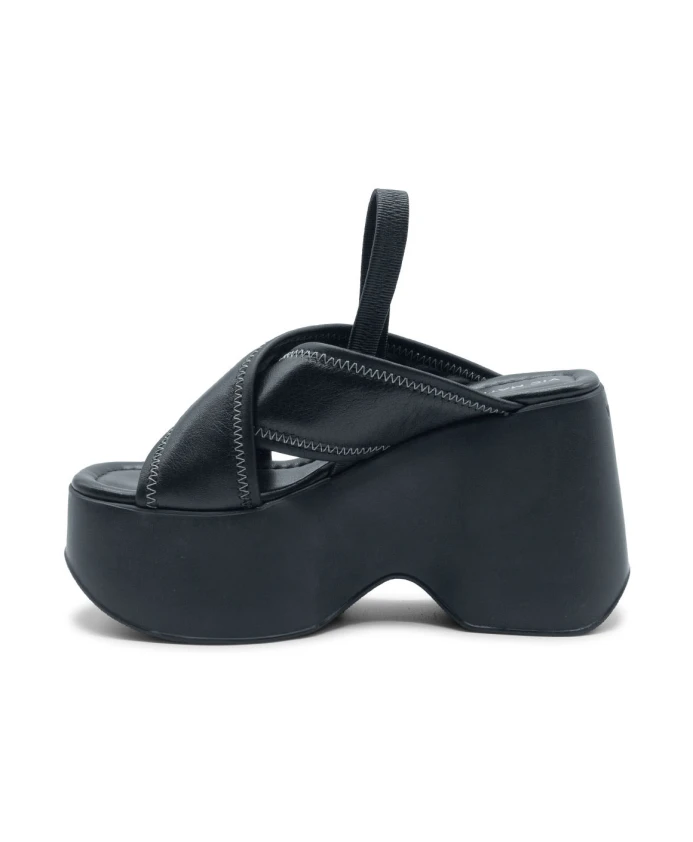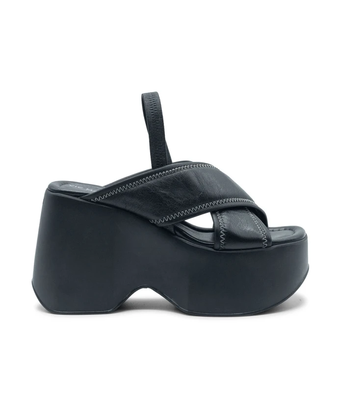 Черные домашние тапочки Yoko из телячьей кожи наппа, с двумя слегка мягкими ремешками, отделанными кожей с зигзагообразной строчкой в тон; эластичная кожаная подкладка для дополнительной устойчивости. Танкетка из сверхлегкого, удобного и подходящего по цвету резиноподобного материала с нескользящей подошвой. Мягкая кожаная стелька, украшенная строчкой. Сделано в Италии. Верх: телячья кожа наппа. Состав подошвы: танкетка из ЭВА. Коллекция: весна-лето 2025. Высота каблука: 110 мм.