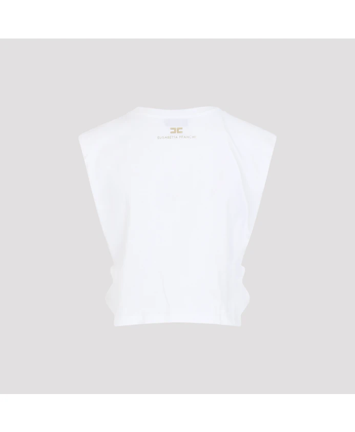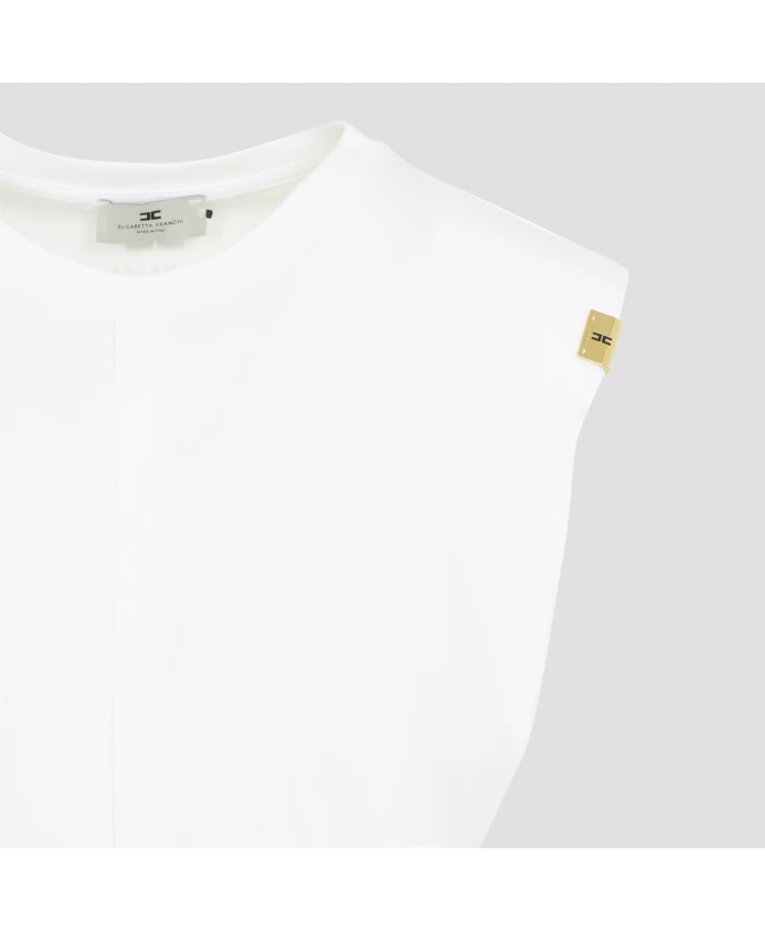 Футболка Elisabetta Franchi с узлом из мягкого хлопкового трикотажа. Безрукавка с круглым вырезом, завязанным узлом по низу для создания приталенного силуэта и деталями с логотипом бренда. Ключевые особенности: Белый | Грунтовка | Хлопок | Подплечники | Круглый вырез | Без рукавов | Завязанный низ | Логотип на спине | Необработанные края и декоративная строчка | Люверсы на пройме | Размеры и посадка: Длина 45 см для размера IT 40 | Стандартный крой | Состав и уход: 100% хлопок