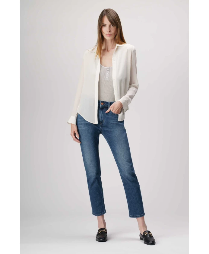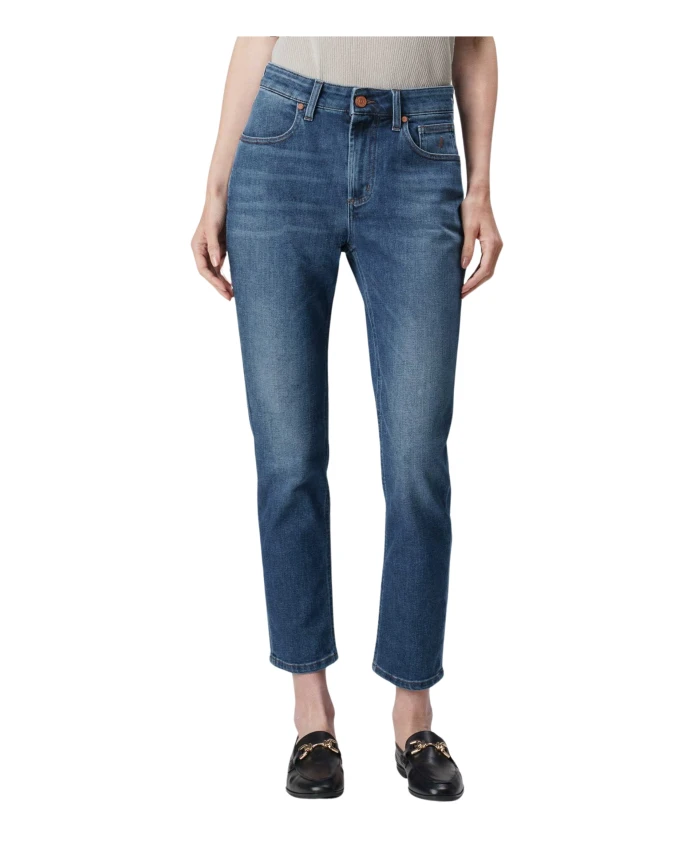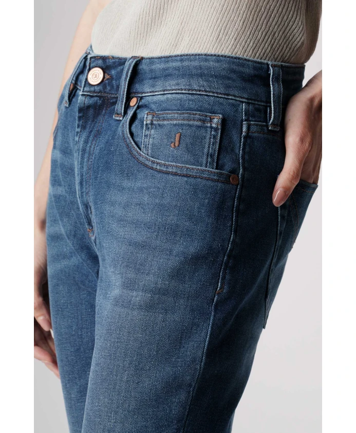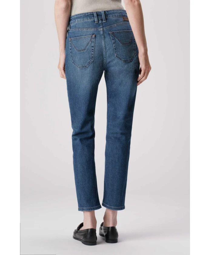 Зауженные брюки Jackerson с пятью карманами, темно-синего цвета, из комфортного денима смешанного состава. Ткань обеспечивает неограниченную свободу движений и превосходную фиксацию формы, сохраняя при этом аутентичный характер и долговечность денима. Имеют внутренний пояс с вышитым названием модели и кроем, тональную строчку и вышитый логотип J на левом кармане. Модель Jacqueline имеет мужскую застежку: пуговицы справа и петли слева. Состав ткани: 93% хлопок, 5% EME, 2% EA.