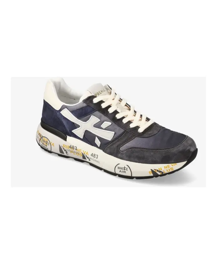 Подчеркните свой стиль с помощью этих синих низких кроссовок Premiata 'MICK 7209' для мужчин. Изготовленные из смеси кожи, замши и полиамида, эти кроссовки имеют шнуровку, серую фирменную нашивку с логотипом сбоку, надписи на резиновой подошве, белый логотип на заднике и круглый носок. Верхняя часть изготовлена из 55% полиамида, 35% телячьей кожи и 10% полиуретана, а подошва состоит из 65% ЭВА, 30% резины и 5% ТПУ. Подкладка изготовлена из 86% козьей кожи и 14% полиуретана.