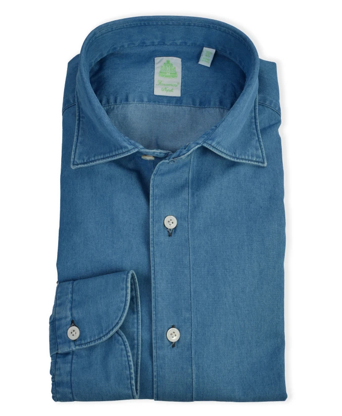 Джинсовая рубашка Finamore из линии Gaeta с мягким воротником. Неаполитанский крой и непревзойденный комфорт - ключевые особенности каждой рубашки Finamore. Изготовлена вручную в семь этапов: пришивание воротника, пришивание пуговиц с классической строчкой в виде геральдической лилии, вышитые петли для пуговиц, пришивание рукавов, пришивание плечевых швов, имитация шва рукава, застежка на перламутровые пуговицы и закругленные манжеты рукавов. Изготовлена из 100% хлопка.