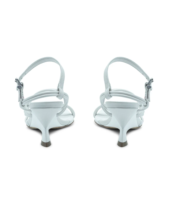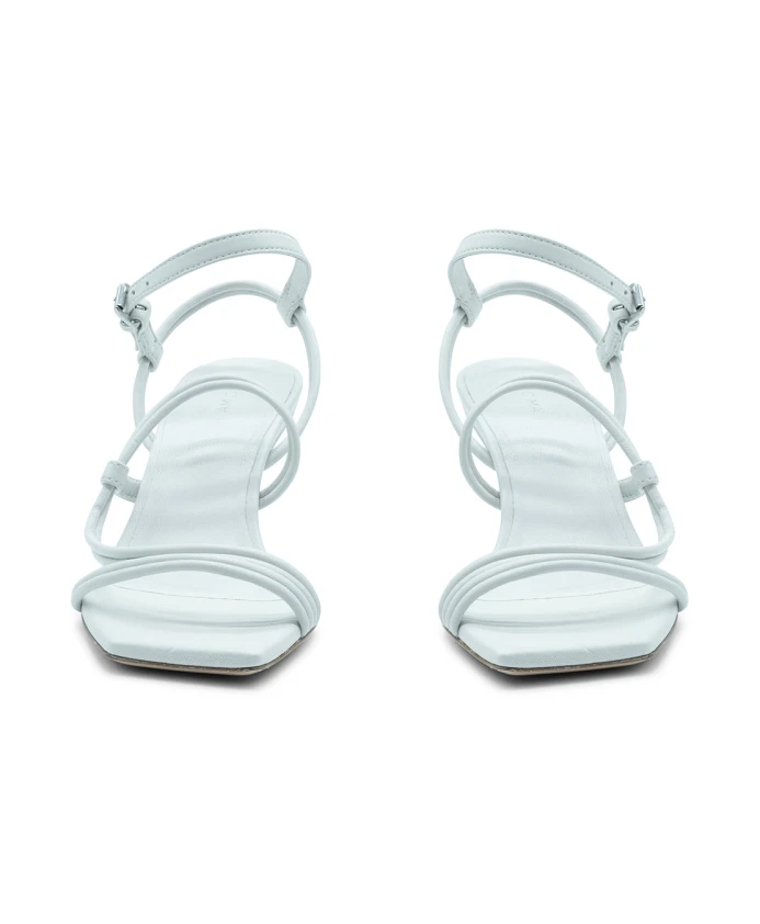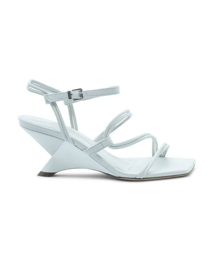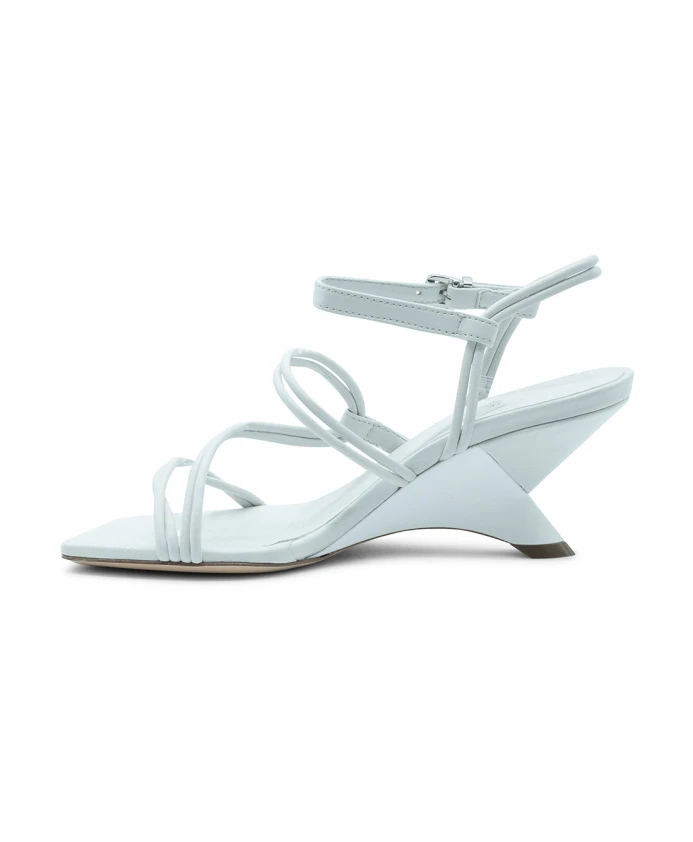 Асимметричные открытые сандалии для пловцов, белого цвета, изготовлены из мягкой кожи наппа. Имеют закругленный носок, обхватывающий пальцы у пятки, скользящий ремешок и регулируемую пряжку на щиколотке. Минималистичный дизайн включает квадратный носок, подчеркивающий танкетку из матовой лакированной кожи, обтянутой кожей в тон. Кожаная подошва. Сделано в Италии. Верх: телячья кожа, кожа наппа. Состав подошвы: кожа. Коллекция: весна-лето 2025. Высота каблука: 60 мм.